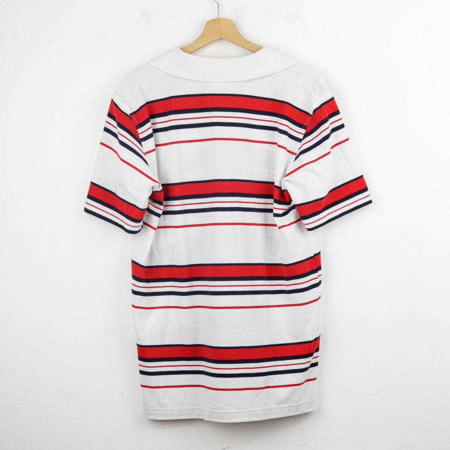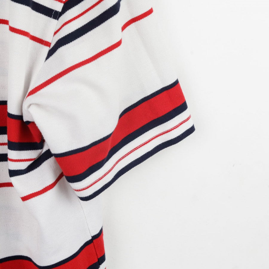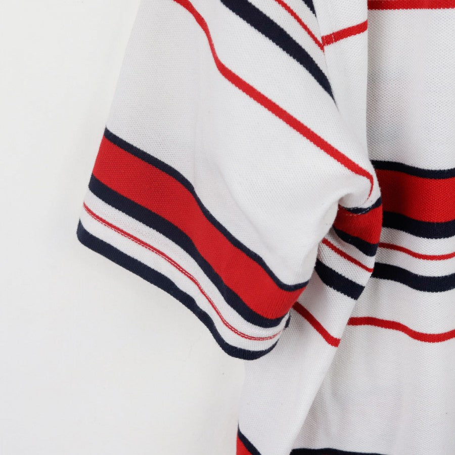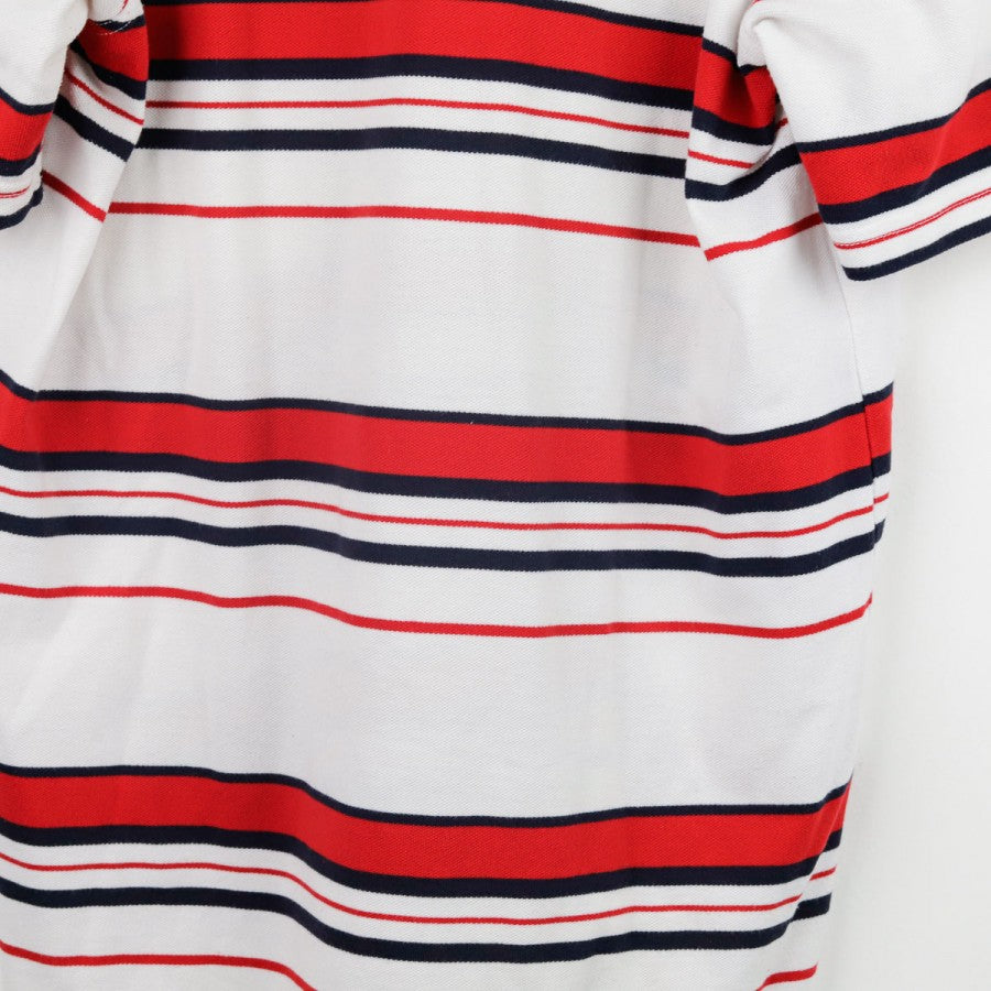 Polo ufficiale della Nazionale Inglese per la stagione 2007/2008, prodotta dallo sponsor tecnico Umbro. Il capo si distingue per la base bianca decorata da righe orizzontali rosse e blu navy che percorrono l'intera maglia, maniche comprese. Sul petto destro è ricamato il logo Umbro in blu, mentre sul lato sinistro si trova lo stemma con i Tre Leoni, simbolo storico della nazionale. Il colletto a polo bianco presenta una chiusura a due bottoni. La taglia indicata è L.