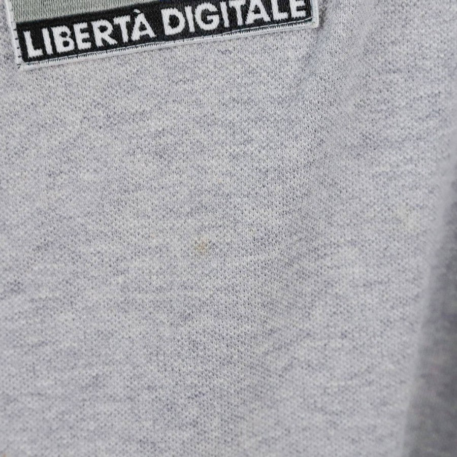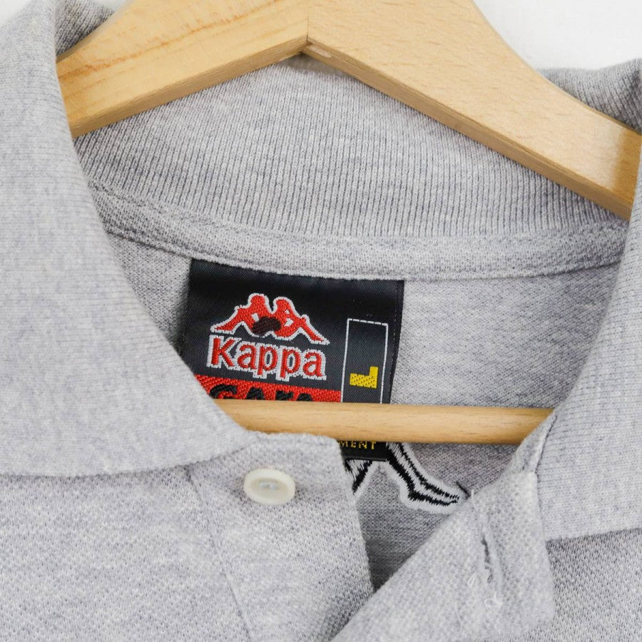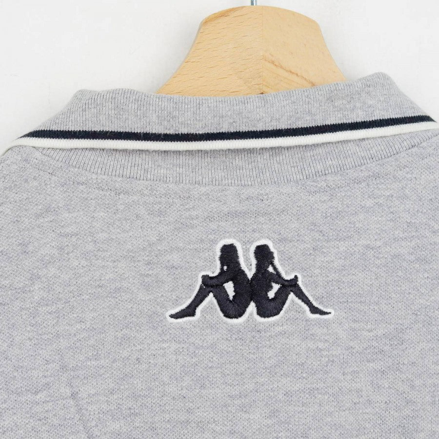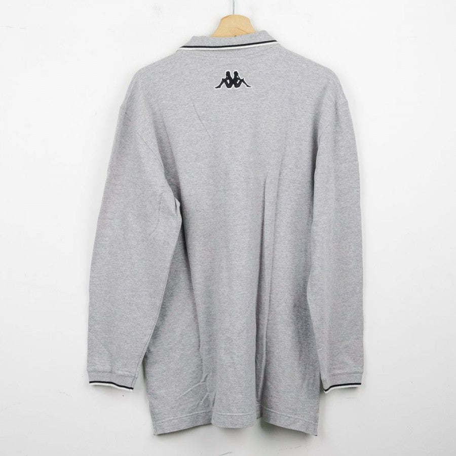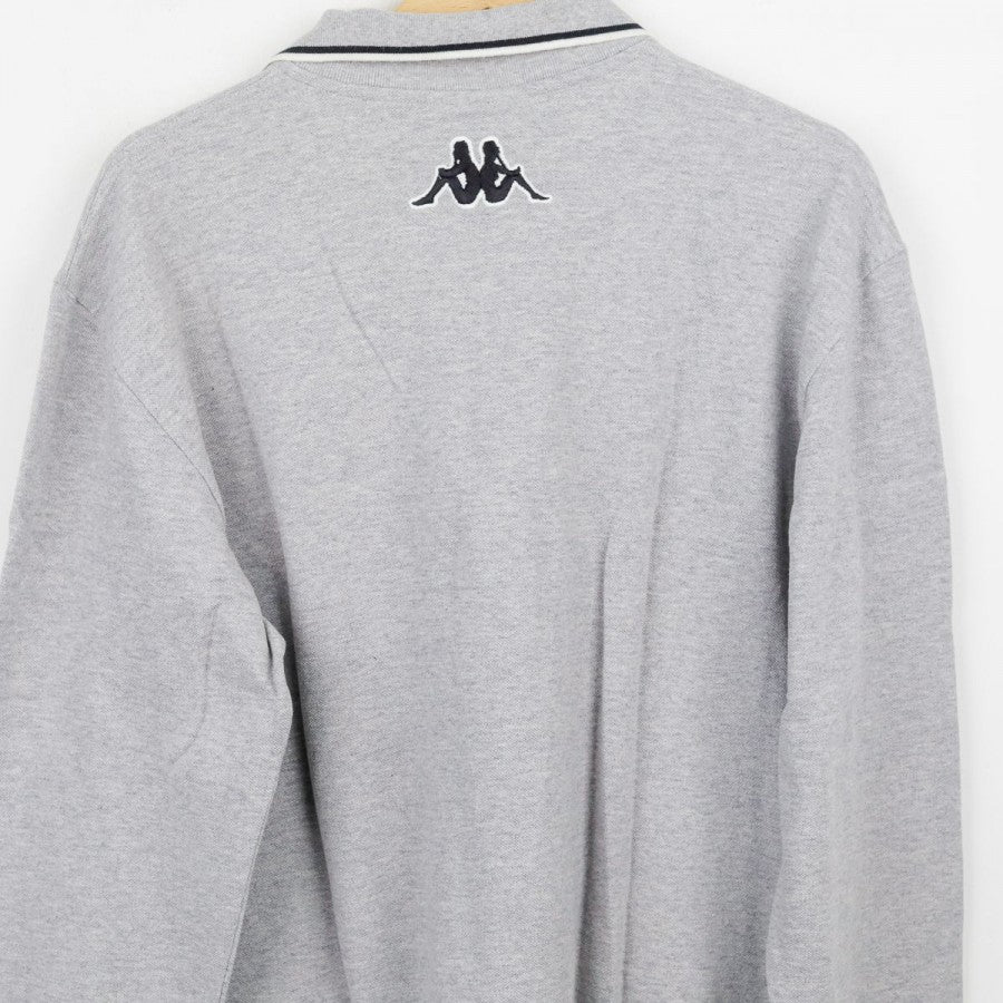 Polo ufficiale a maniche lunghe della Juventus per la stagione 1999/2000, realizzata da Kappa. Il capo è in cotone grigio chiaro con colletto a costine e bordo maniche rifiniti da una doppia riga nera. Sul petto si trovano il logo Kappa, la scritta Juventus, lo sponsor commerciale D+ (Libertà Digitale) e lo stemma societario con due stelle. Sul retro è visibile il logo Kappa ricamato sotto il colletto. Taglia: L, come da etichetta della linea “Kappa Gara – Official Pro Equipment”.