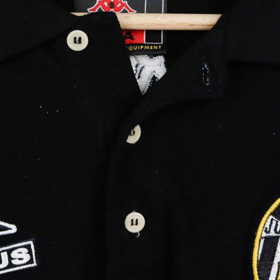 Polo ufficiale della Juventus stagione 1999/2000 prodotta da Kappa. Realizzata in cotone nero con colletto e bordo maniche rifiniti da dettagli bianchi, presenta sul petto il logo Kappa, la scritta Juventus, lo sponsor commerciale D+ (Libertà Digitale) e lo stemma del club con due stelle. Sul retro, sotto il colletto, è visibile un logo Kappa bianco ricamato. L'etichetta interna riporta la dicitura “Kappa Gara – Official Pro Equipment”. Taglia non indicata.