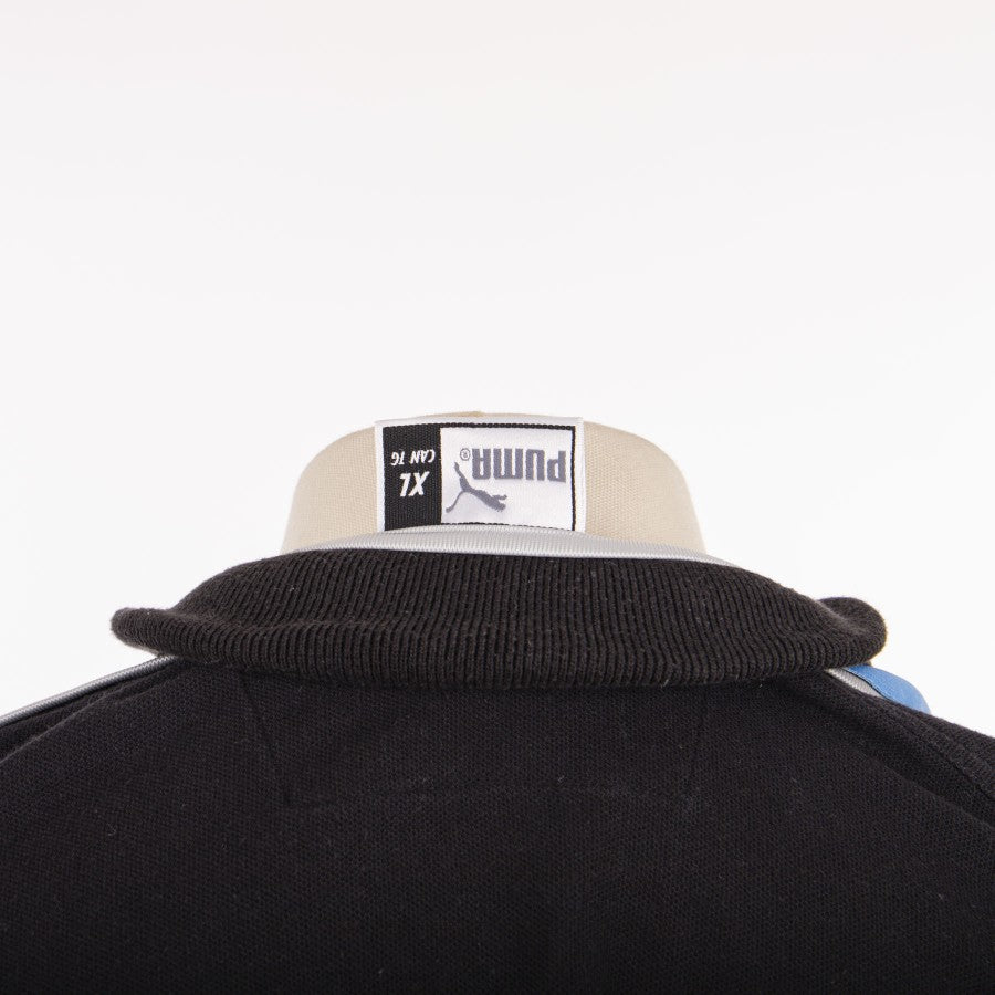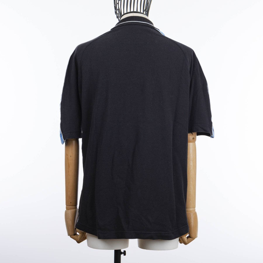 Modello polo a maniche corte nero con inserti celesti, tessuto comodo interamente in cotone. Il colletto , modello polo, in maglina, con bordino bianco, presenta la chiusura a zip. Lungo le spalle è presente una banda celeste ricamata con il logo dello sponsor tecnico Puma ripetuto più volte. sul fronte lato cuore cucito la patch laziale a destra ricamato il logo Puma. Al centro è applicato il logo dello sponsor commerciale Cirio.