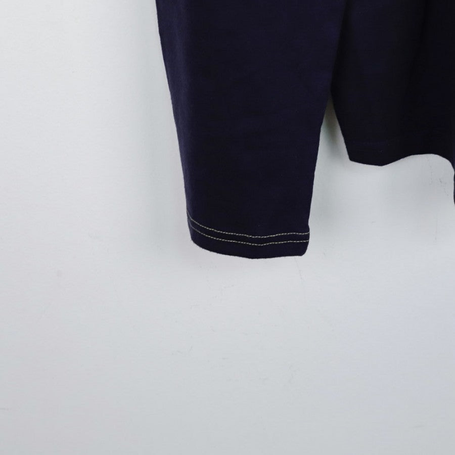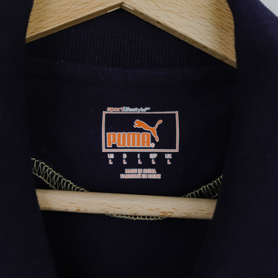 Polo ufficiale della Lazio, stagione 2011/2012, prodotta dallo sponsor tecnico Puma. Questa maglia a maniche lunghe presenta un design elegante in blu scuro, con dettagli caratterizzati da due bande orizzontali in azzurro e beige sul petto. Lo stemma della Lazio è cucito lato cuore, mentre il logo Puma è applicato sia sul petto destro che sulle maniche. La maglia non ha sponsor commerciale visibile, offrendo un look pulito e sobrio, ideale per collezionisti e tifosi biancocelesti.