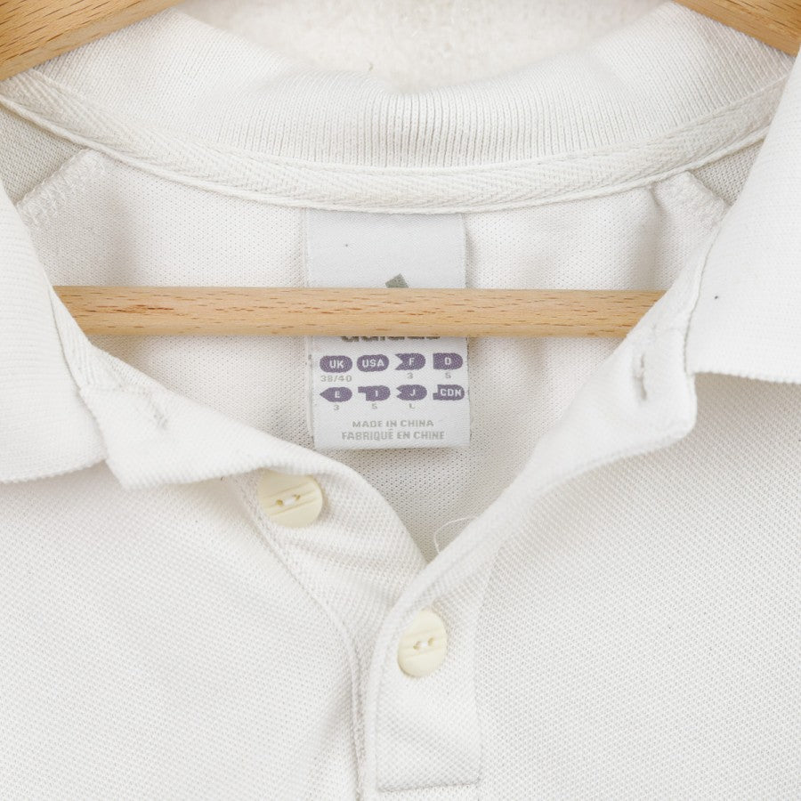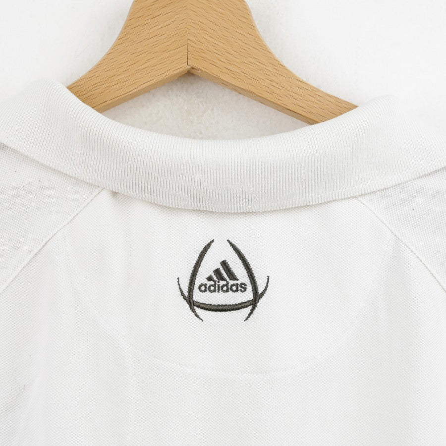 Polo Milan Adidas 2005/2006 in tessuto tecnico bianco con dettagli rossi e neri sulle spalle e finiture sottili sul pannello frontale. Il logo tecnico Adidas è presente sul petto, accanto allo stemma del Milan e allo sponsor commerciale Opel. Sul retro, appena sotto il colletto, è visibile un ulteriore logo Adidas. La taglia riportata è S.