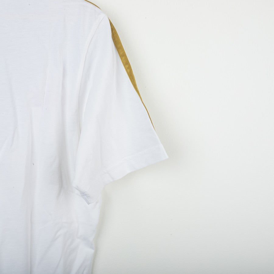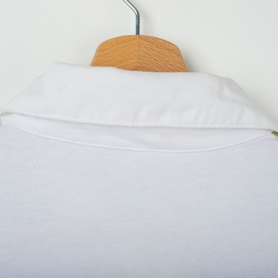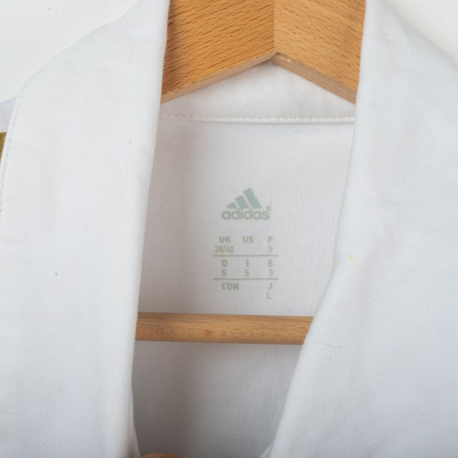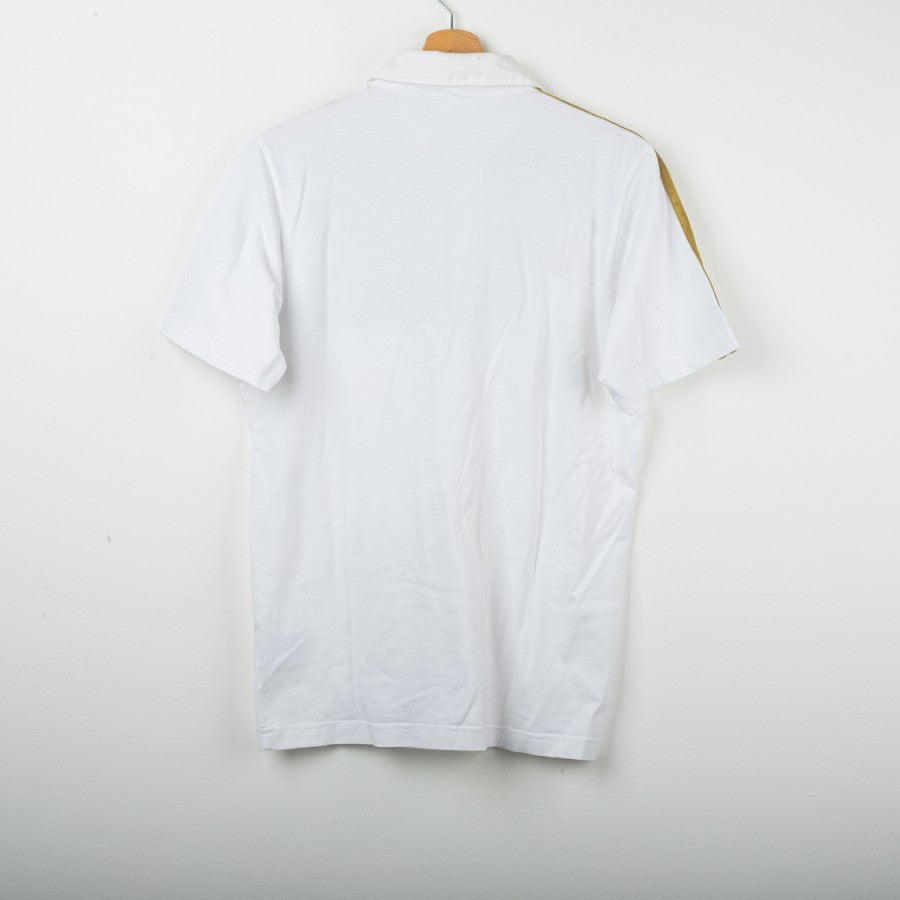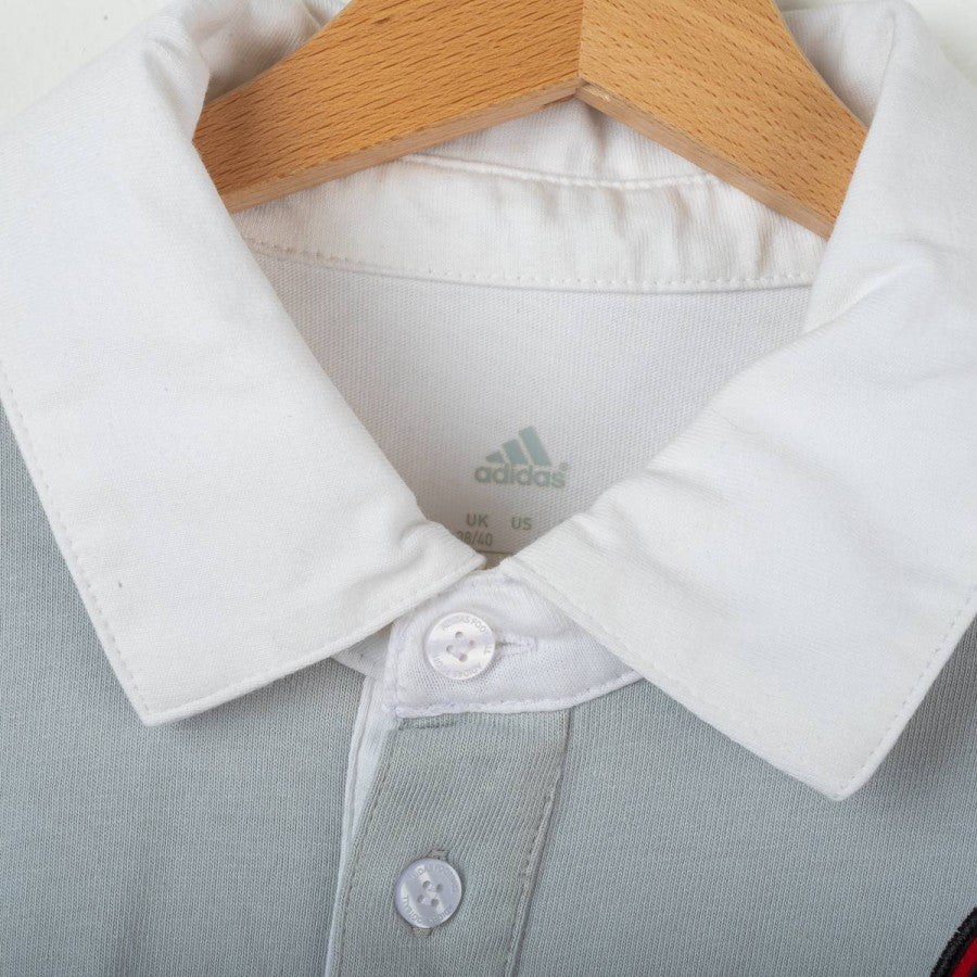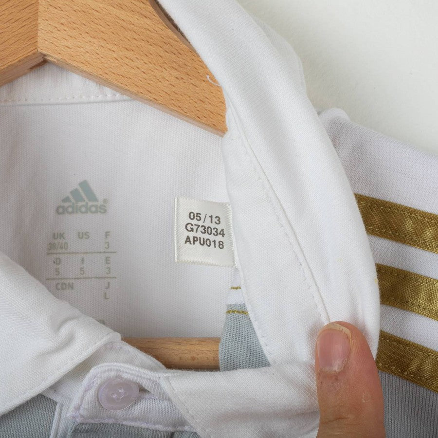 Polo ufficiale AC Milan Adidas stagione 2013/2014, prodotta da Adidas per la linea di rappresentanza. Modello bianco con fascia grigia sul petto attraversata da una banda tricolore verde, bianca e rossa. Logo Adidas ricamato in rosso sulla spalla destra, stemma AC Milan ricamato sul lato cuore e sponsor Fly Emirates stampato. Dettaglio con tre strisce dorate sulle maniche e colletto a polo con bottoni. Una polo elegante e iconica, pensata per il tempo libero e le occasioni ufficiali della squadra rossonera. Taglia L.