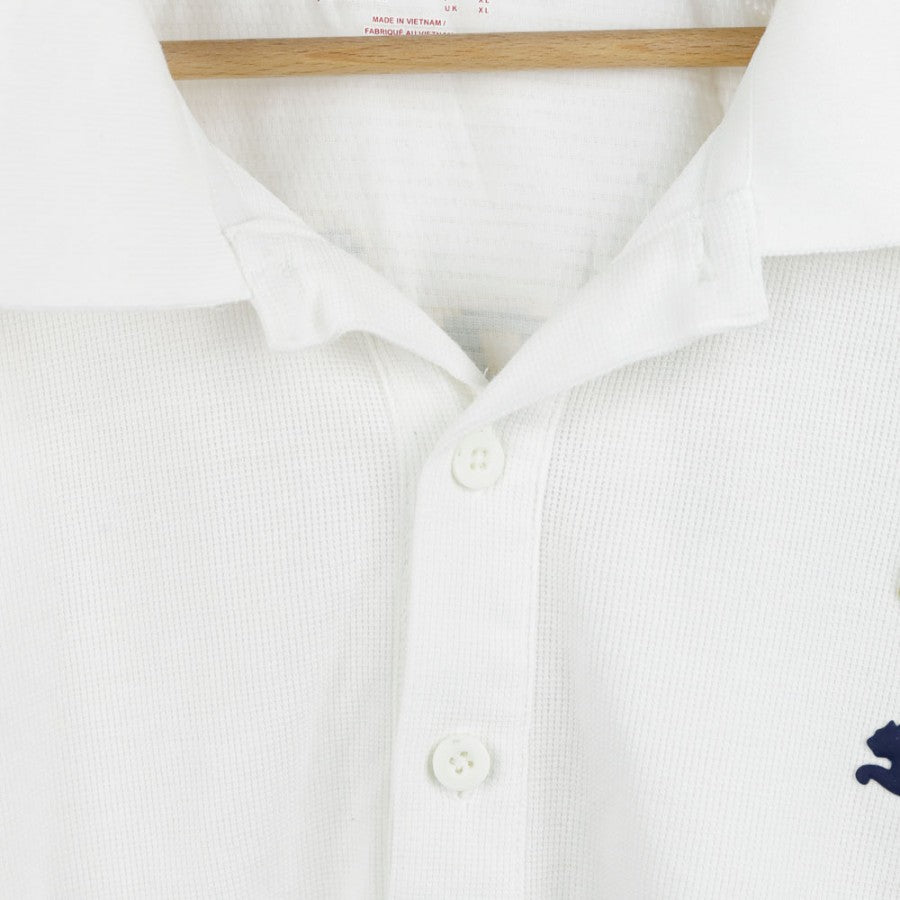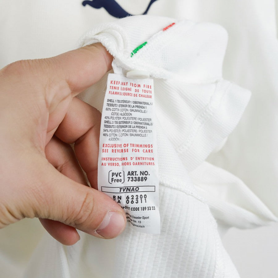Polo ufficiale della Nazionale Italiana di calcio realizzata da Puma per la stagione 2007. Design elegante con base bianca, dettagli tricolore sulla parte inferiore e scritta "Italia" sul retro. Il logo della FIGC è ricamato sul petto, affiancato dal classico logo Puma. Taglia XL.