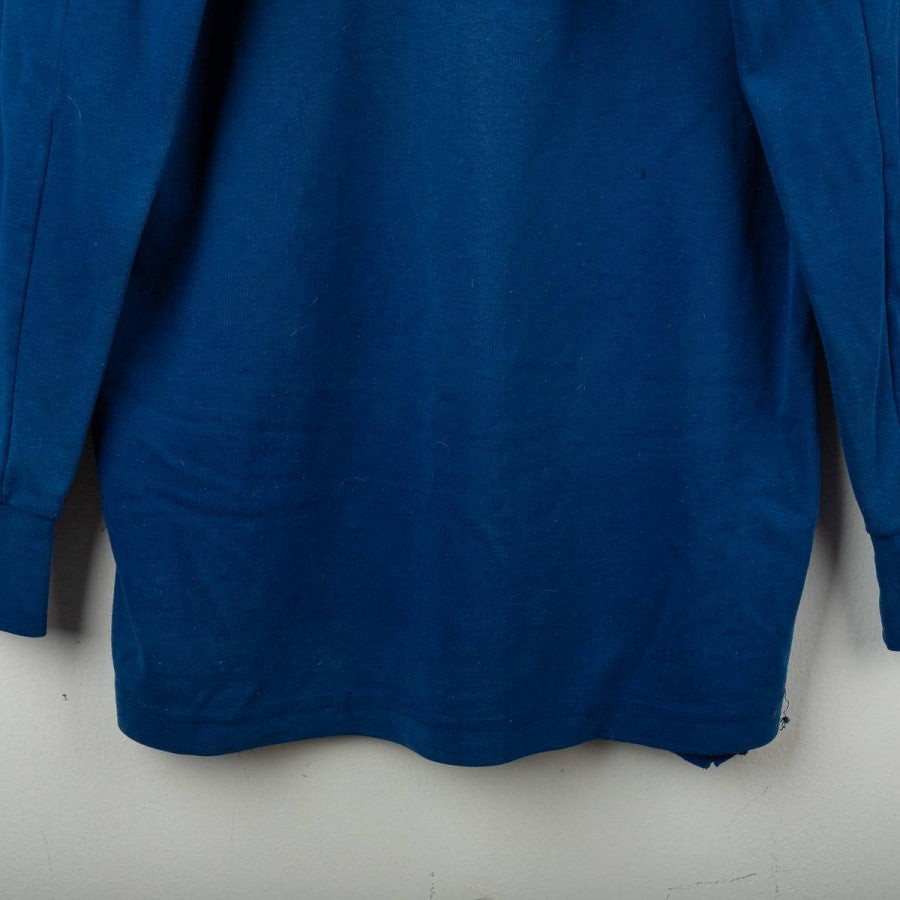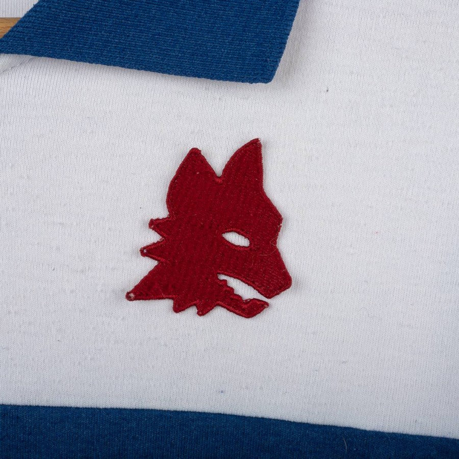 Polo della AS Roma indossata nella stagione 1995/1996, prodotta da Asics. Colore blu con fascia orizzontale bianca sul petto e inserti arancioni con logo Asics sulle spalle. Stemma della Roma in feltro rosso cucito lato cuore. Logo Asics ricamato in bianco su patch nera lato destro. Colletto a polo blu. Maniche lunghe con polsini elasticizzati. Vestibilità regolare.