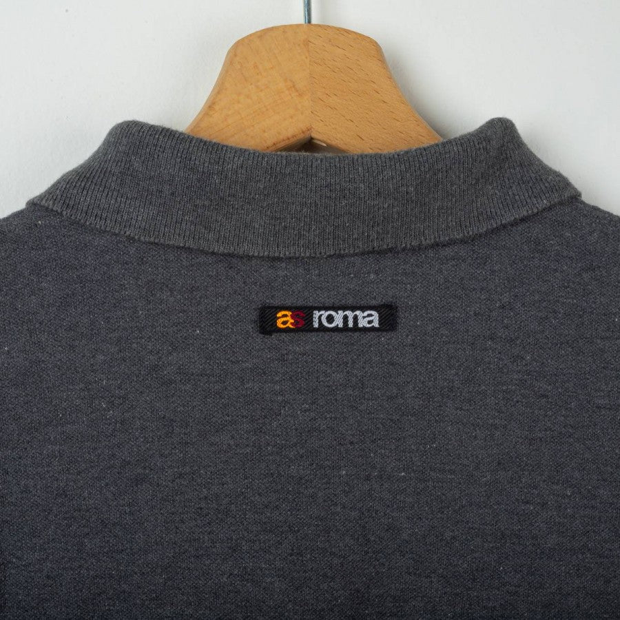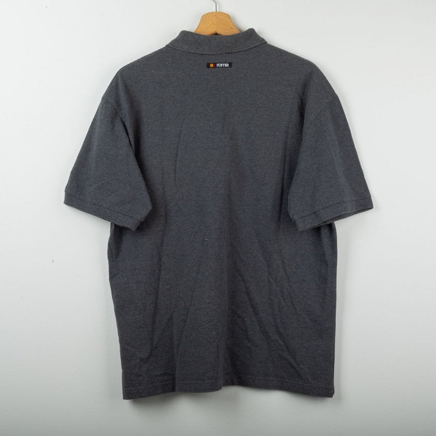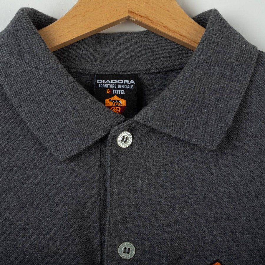 Polo Diadora della Roma stagione 1998/1999. Modello in cotone grigio scuro con design semplice ed elegante. Logo Diadora ricamato in bianco sul petto destro e stemma AS Roma con la lupa Capitolina ricamato lato cuore. Colletto a polo con chiusura a due bottoni personalizzati Diadora, maniche corte. Sul retro sotto il colletto piccola etichetta “as roma”. Vestibilità regolare.