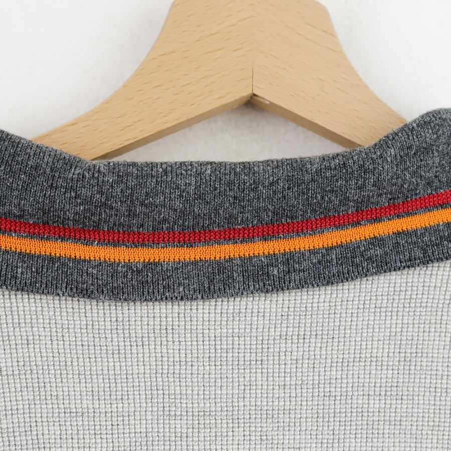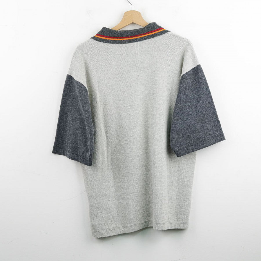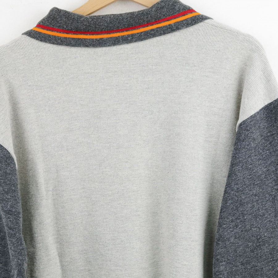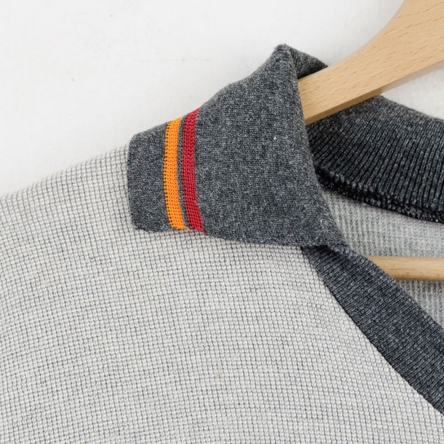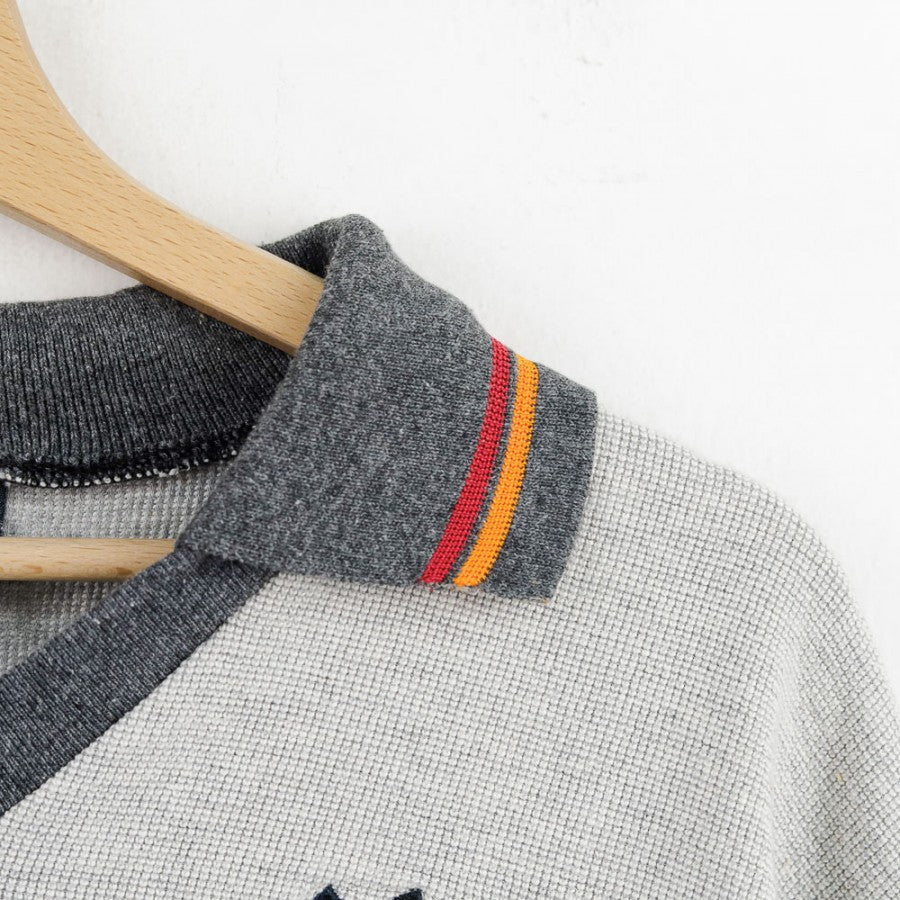 Polo ufficiale dell'AS Roma utilizzata nella stagione 1999/2000, realizzata da Diadora. Il logo tecnico è presente sul petto, insieme alla celebre testa di lupo, simbolo alternativo del club in quegli anni. La maglia si distingue per il suo tessuto grigio mélange in stile maglieria, con maniche più scure e colletto polo impreziosito da dettagli giallorossi. Il logo “as roma” è visibile sul fronte con caratteri bold delineati in rosso.