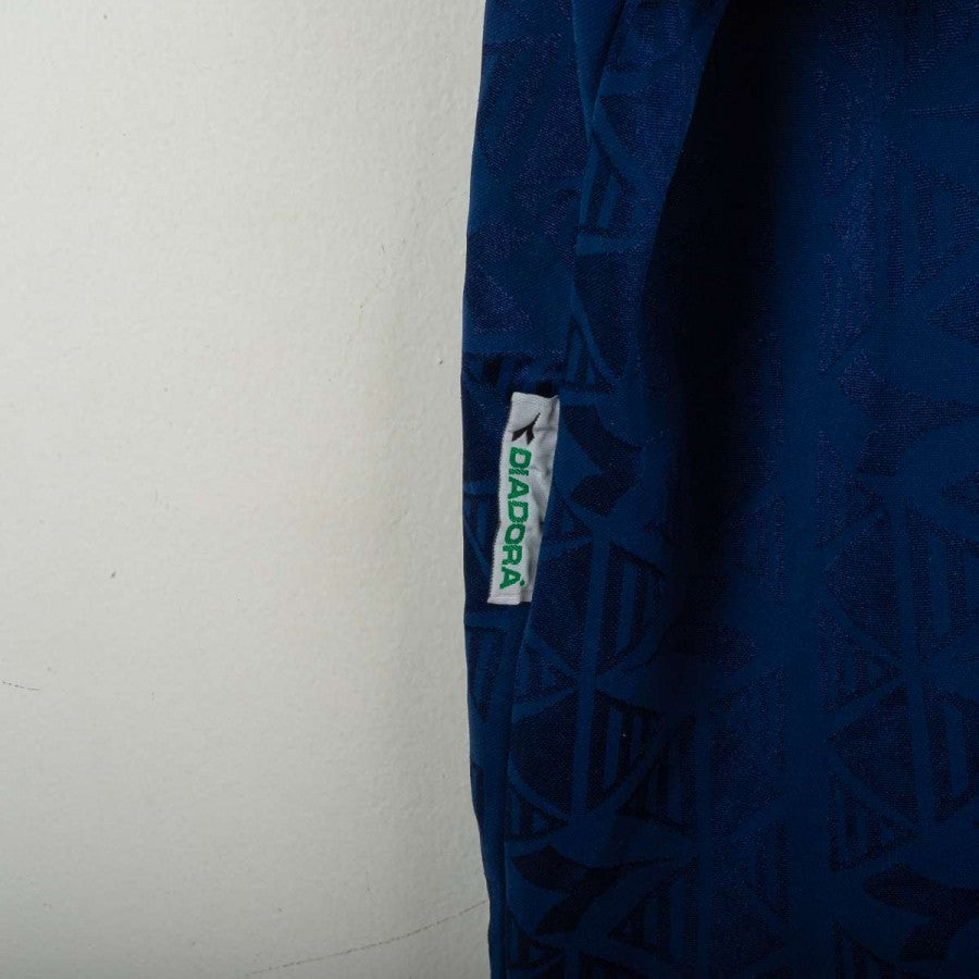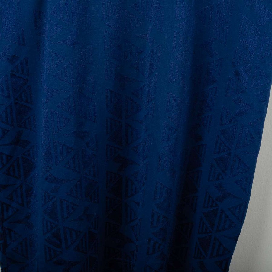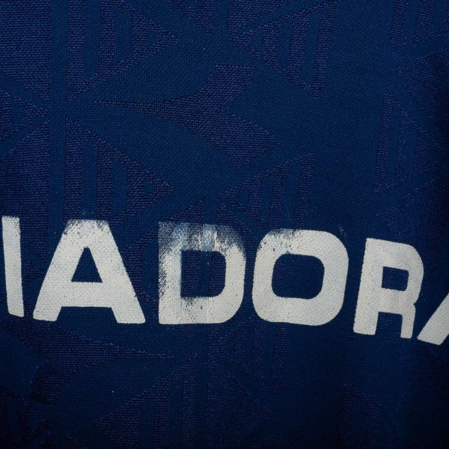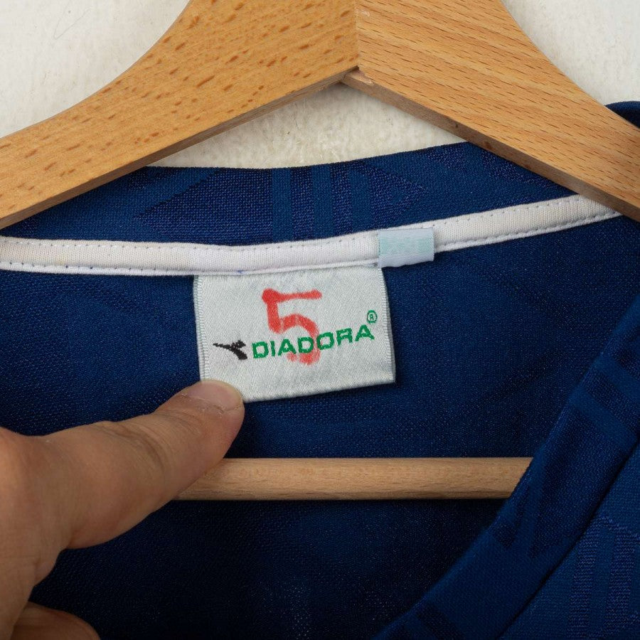 T-shirt di allenamento della Fiorentina utilizzata nella stagione 2000/2001, prodotta da Diadora. Colore blu con pattern geometrico tono su tono. Logo Diadora e sponsor Toyota applicati in stampa bianca. Stemma della Fiorentina cucito lato cuore. Sul retro, grande scritta Diadora stampata in bianco. Modello a girocollo con maniche corte. Taglia XXL.