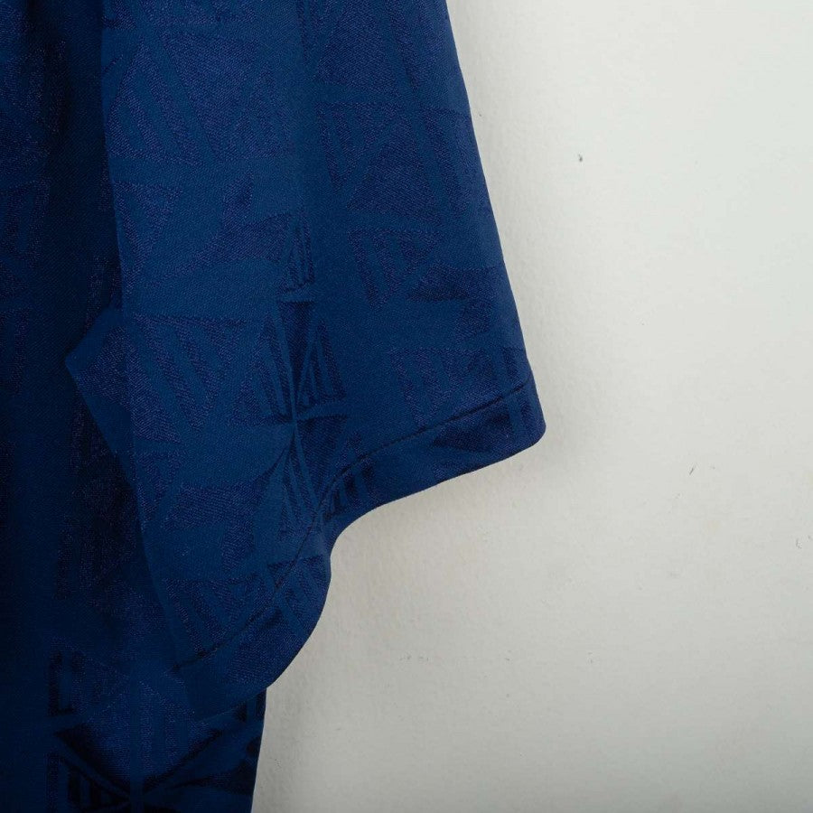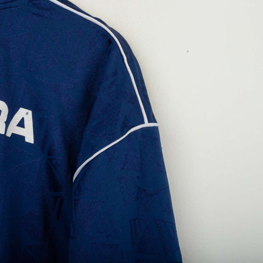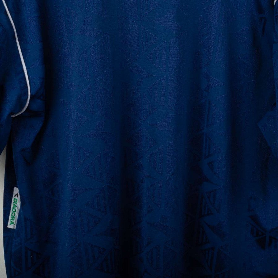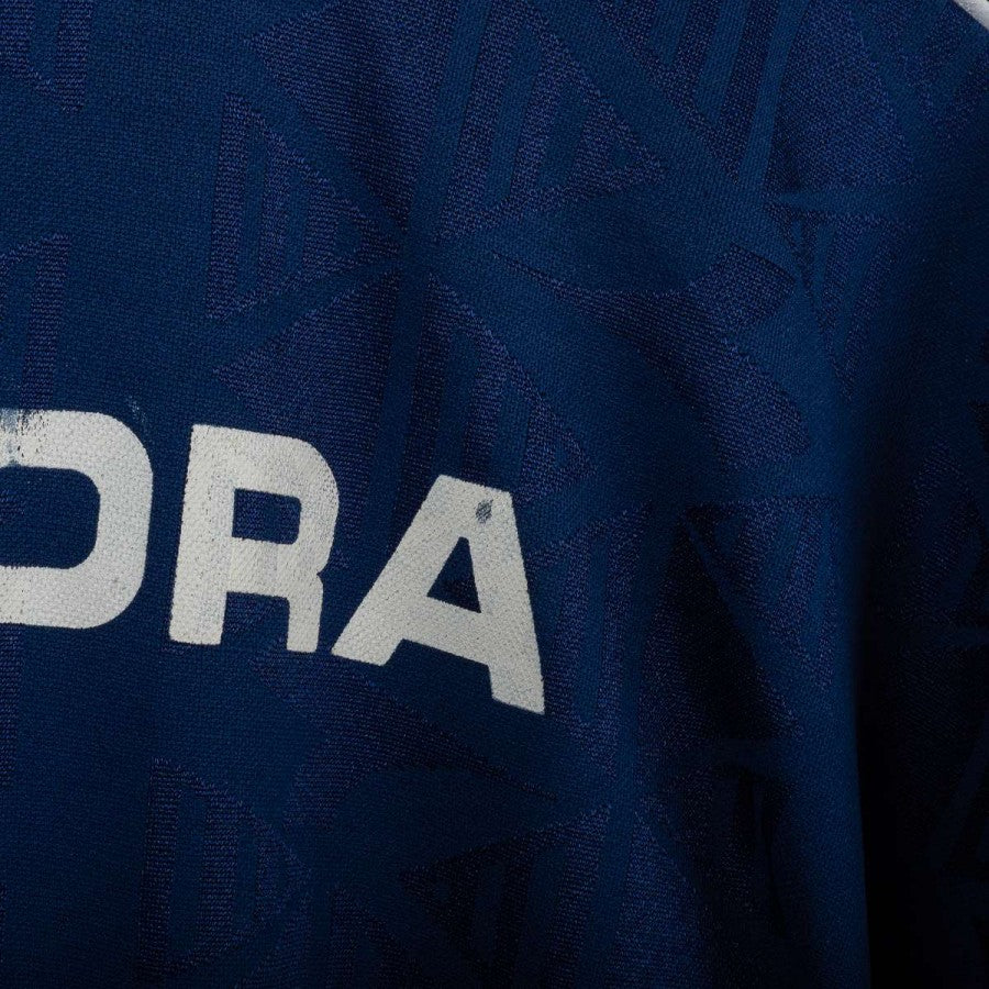 T-shirt di allenamento della Fiorentina utilizzata nella stagione 2000/2001, prodotta da Diadora. Colore blu con pattern geometrico tono su tono. Logo Diadora e sponsor Toyota applicati in stampa bianca. Stemma della Fiorentina cucito lato cuore. Sul retro, grande scritta Diadora stampata in bianco. Modello a girocollo con maniche corte. Taglia XXL.