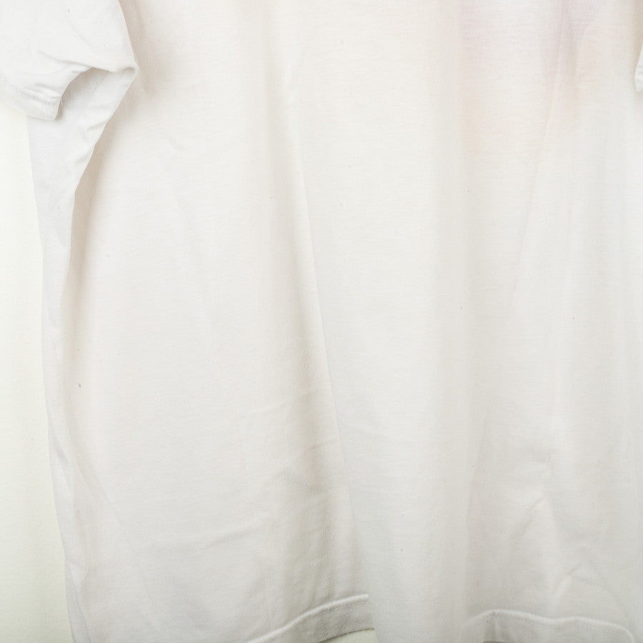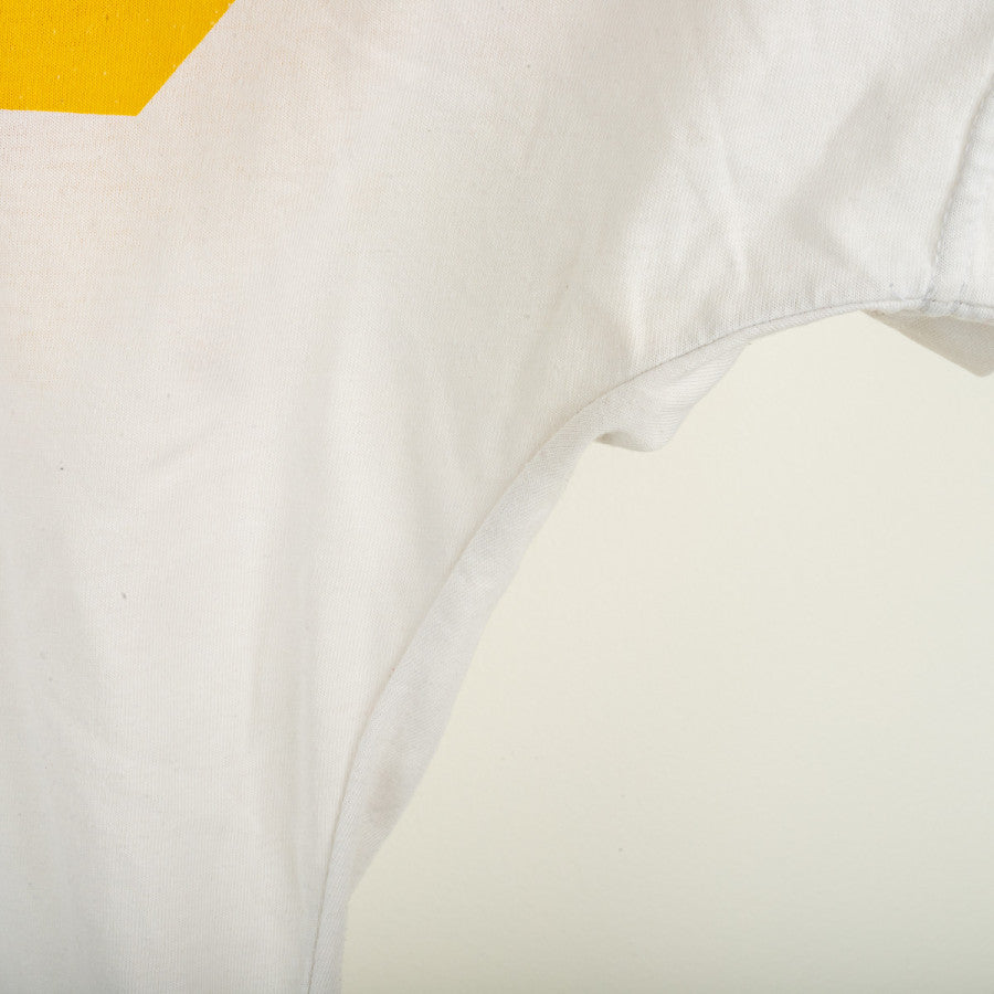 T-shirt di allenamento della Germania prodotta da Adidas per la stagione 1990. Modello bianco con iconiche bande diagonali nei colori della bandiera tedesca: nero, rosso e giallo. Logo Adidas Trefoil e stemma Deutscher Fussball-Bund stampati sul petto. Realizzata in cotone leggero, ideale per l'allenamento e il tempo libero. Vestibilità regolare.