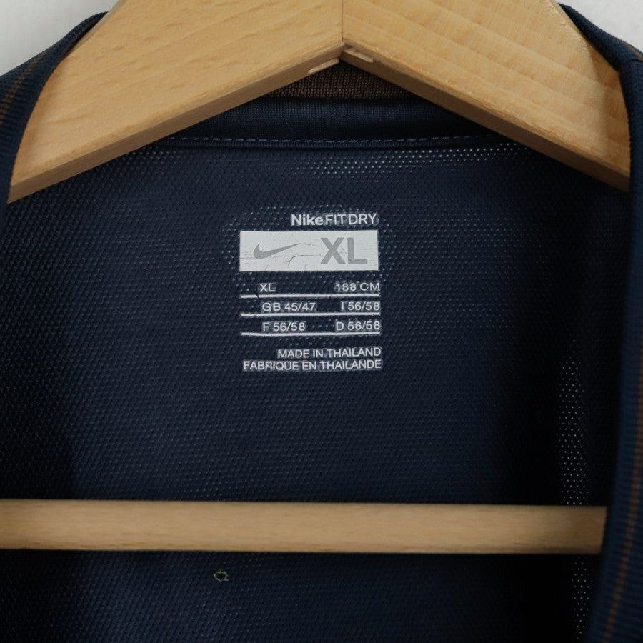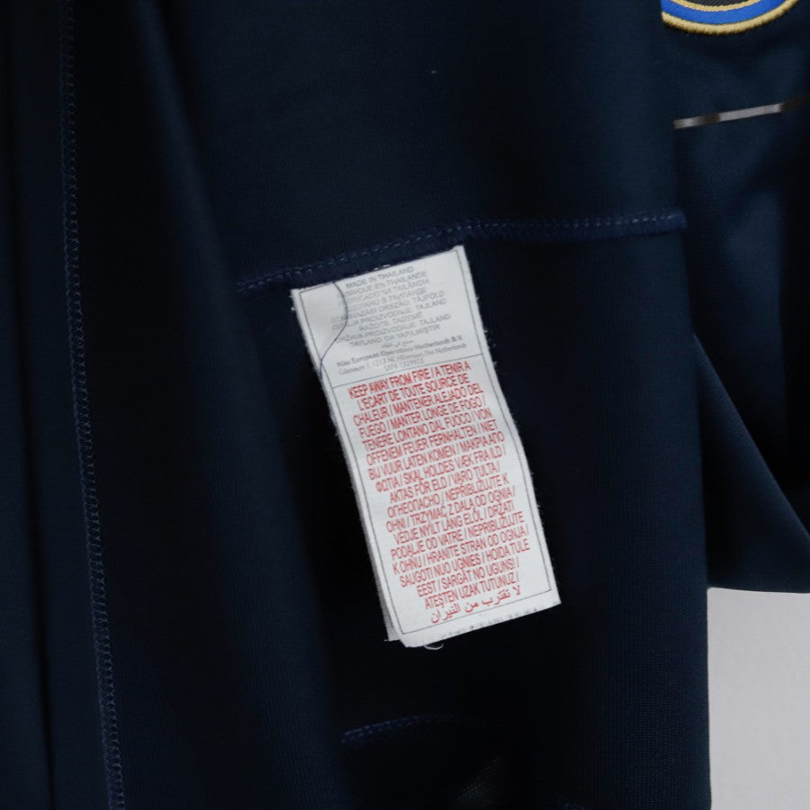 T-shirt da allenamento ufficiale dell'Inter, stagione 2008/2009, prodotta dallo sponsor tecnico Nike. Il design presenta un elegante colore blu scuro con dettagli dorati, in onore dello Scudetto vinto nella stagione precedente. Sul petto sono applicati lo stemma del club con la stella sopra, il tricolore e il logo Nike in oro. Sul retro, nella parte alta, è presente un piccolo logo Nike inserito in un dettaglio stilizzato. Il tessuto Nike FIT DRY garantisce traspirabilità e comfort, ed è disponibile nella taglia XL.