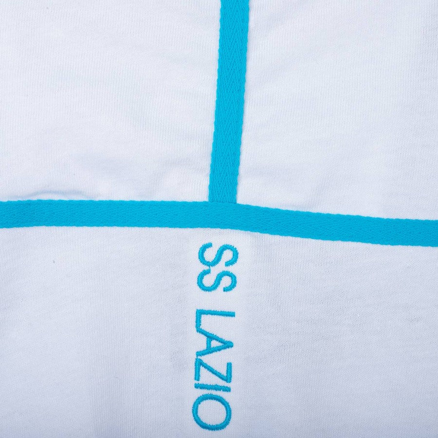 T-shirt di allenamento della Lazio prodotta da Macron per la stagione 2018/2019. Modello in colore bianco con dettagli celesti, presenta il logo Macron ricamato sul petto destro e lo stemma del club cucito sul lato cuore. Sul retro è riportata la scritta “SS LAZIO 1900” in celeste. Vestibilità regolare, tessuto leggero e traspirante, ideale per l'allenamento e il tempo libero. Taglia XXL.