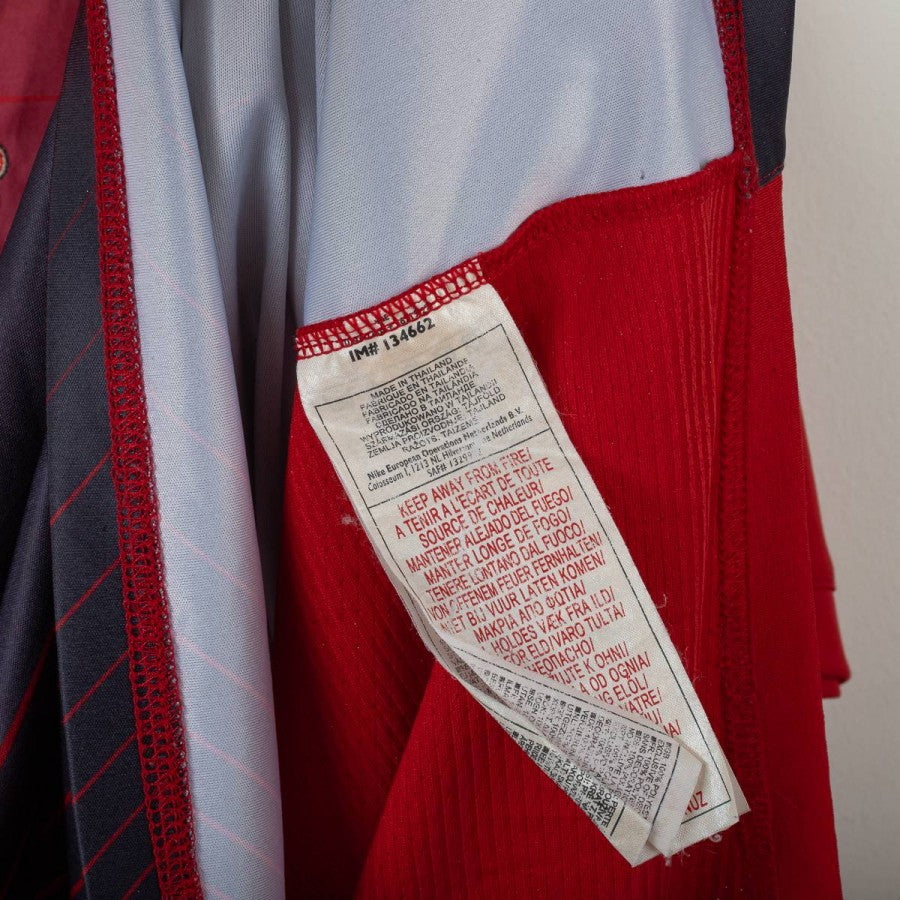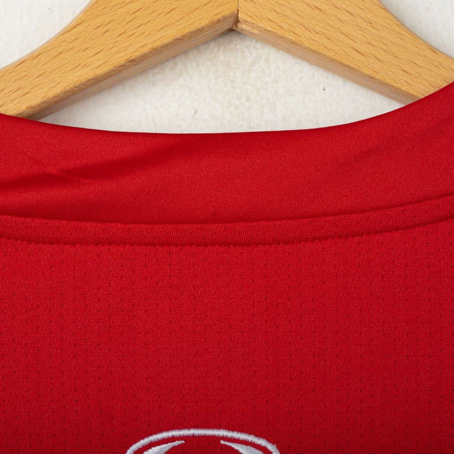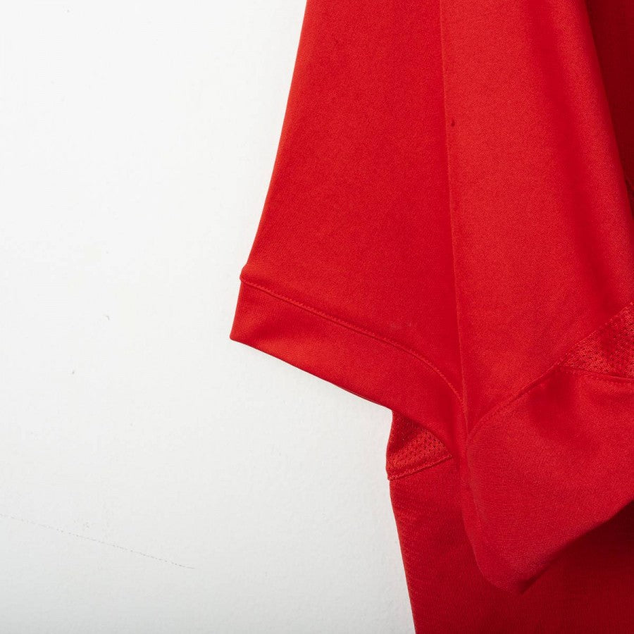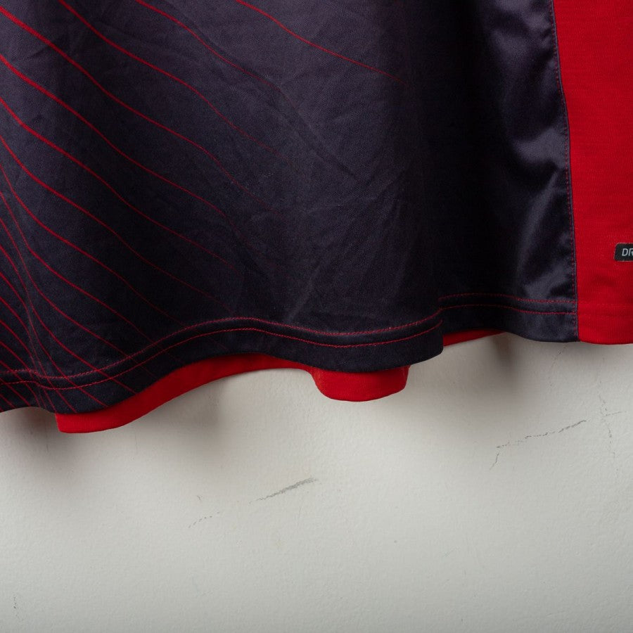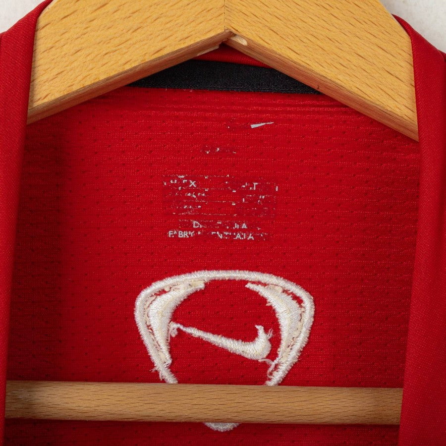 T-shirt Allenamento Manchester United Nike 2005/2006. La maglia è realizzata da Nike, sponsor tecnico del club inglese in quel periodo. Il logo del club è posizionato sul petto insieme al baffo Nike. Il design è caratterizzato da una sfumatura dal rosso al nero con dettagli a onde, molto distintivo per quell'annata. Sul retro è presente il logo Nike all'interno di uno scudetto. Taglia XL