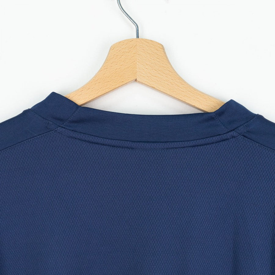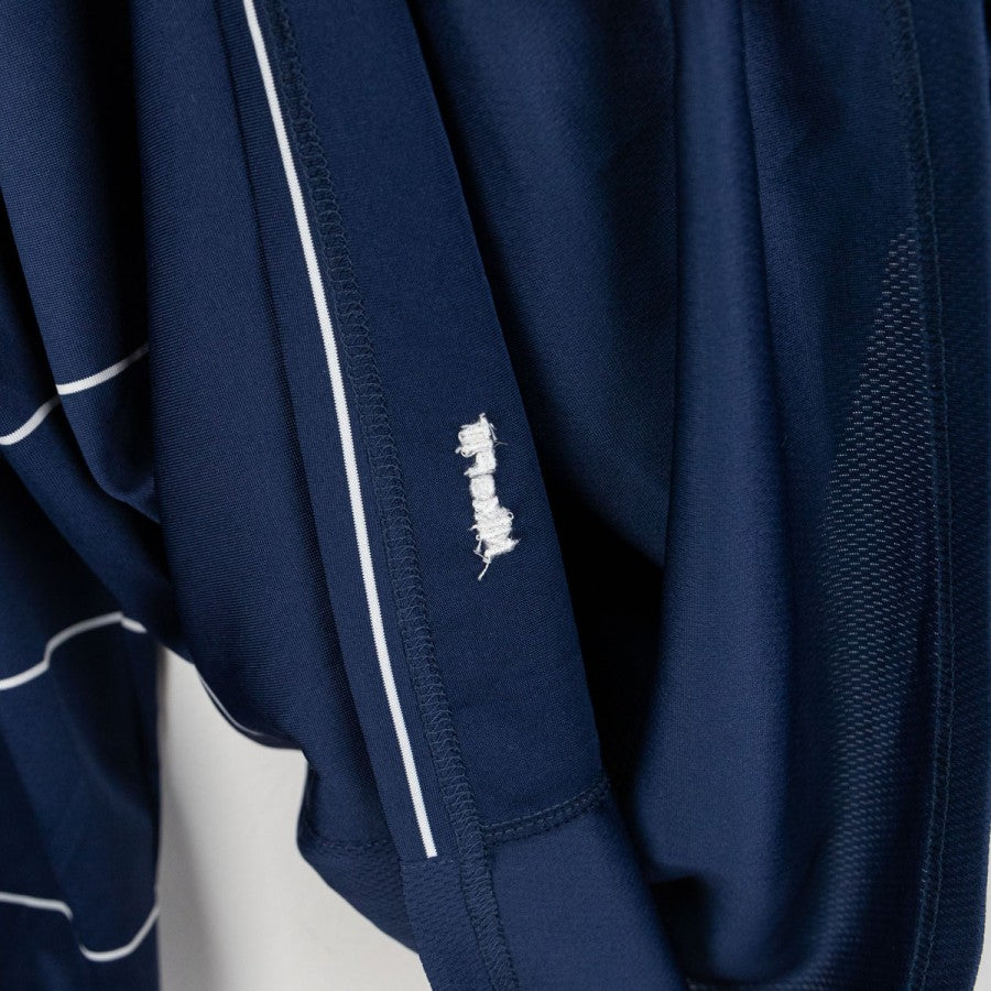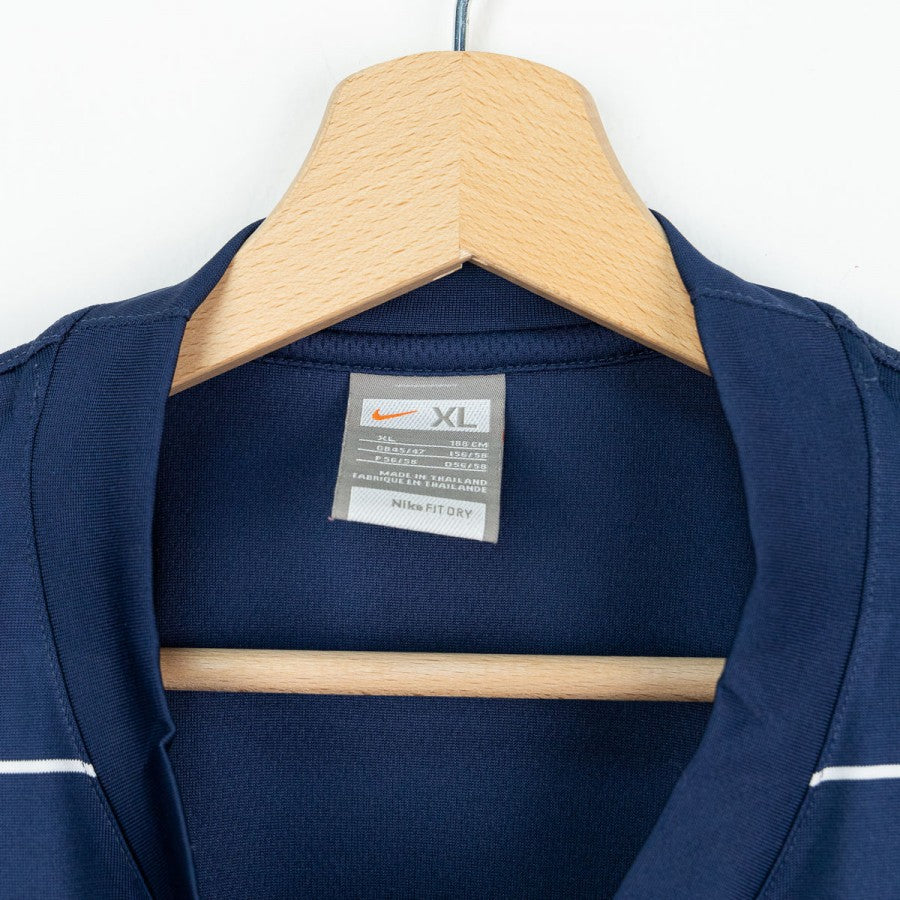 Maglia da allenamento ufficiale dell'Inter a manica lunga, utilizzata nella stagione 2009/2010, anno storico in cui la squadra conquistò il Triplete sotto la guida di José Mourinho. Realizzata dallo sponsor tecnico Nike, presenta un design semplice e pulito: base blu navy con sottili righe orizzontali bianche, logo Nike ricamato e stemma del club cucito sul petto. Il modello è realizzato in tessuto tecnico Dri-FIT, pensato per offrire traspirabilità e comfort durante gli allenamenti. La taglia indicata è XL.
