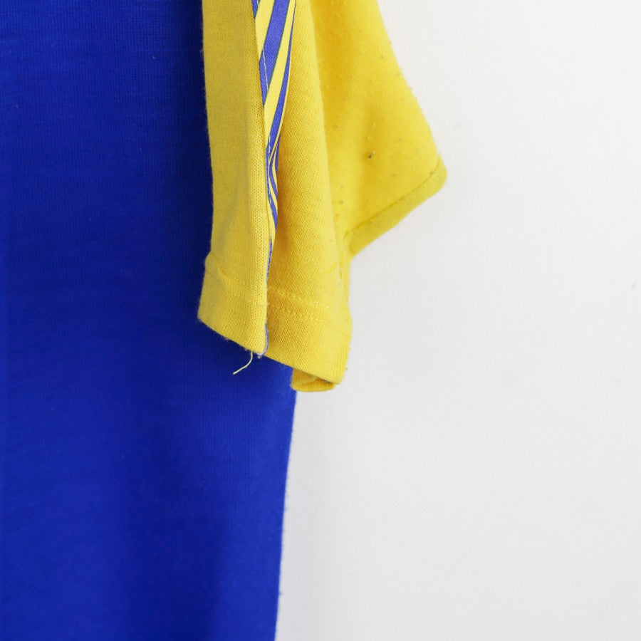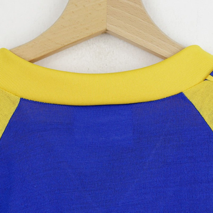T-shirt da allenamento del Parma risalente alla stagione 1993/1994, realizzata da Umbro. Il design si distingue per la combinazione di colori giallo e blu, con corpo centrale blu acceso e maniche gialle arricchite da una grafica geometrica. Sul petto sono presenti lo sponsor tecnico Umbro e lo sponsor commerciale Parmalat, insieme allo stemma del club. Colletto a V in giallo. Taglia XL.
