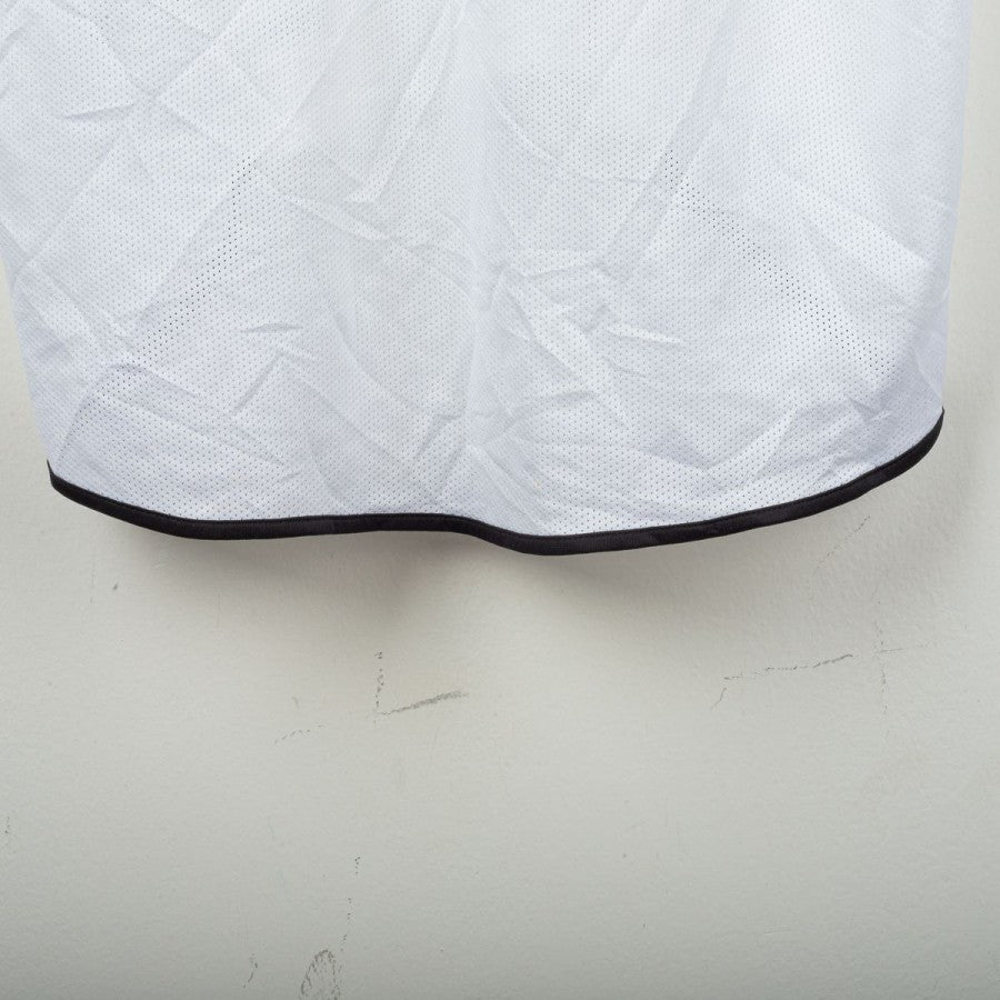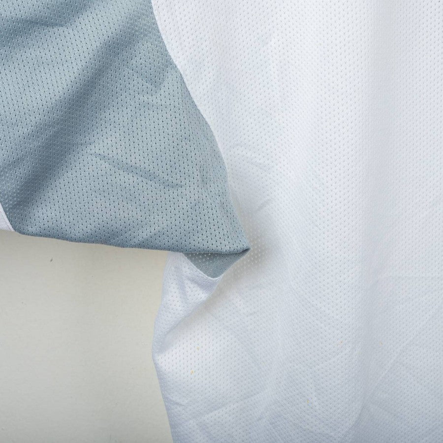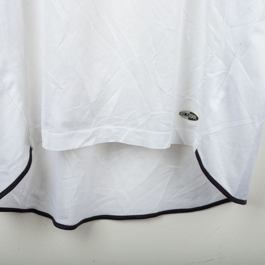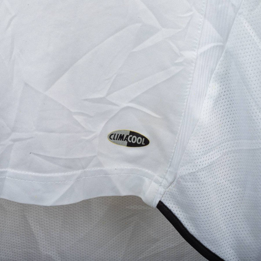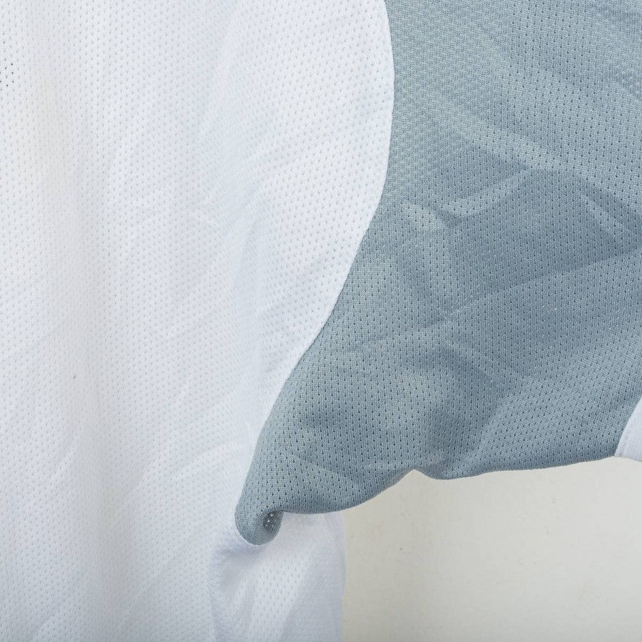 Maglia da allenamento del Real Madrid prodotta da Adidas per la stagione 2004/2005. Modello a maniche corte di colore bianco con inserti grigi sulle spalle e piping nero su maniche e orlo. Logo Adidas ricamato in nero sul lato destro del petto e stemma del Real Madrid cucito lato cuore. Design con tre strisce Adidas nere sulle spalle e pannelli in mesh sul retro per maggiore traspirabilità. Vestibilità regolare. Taglia L.