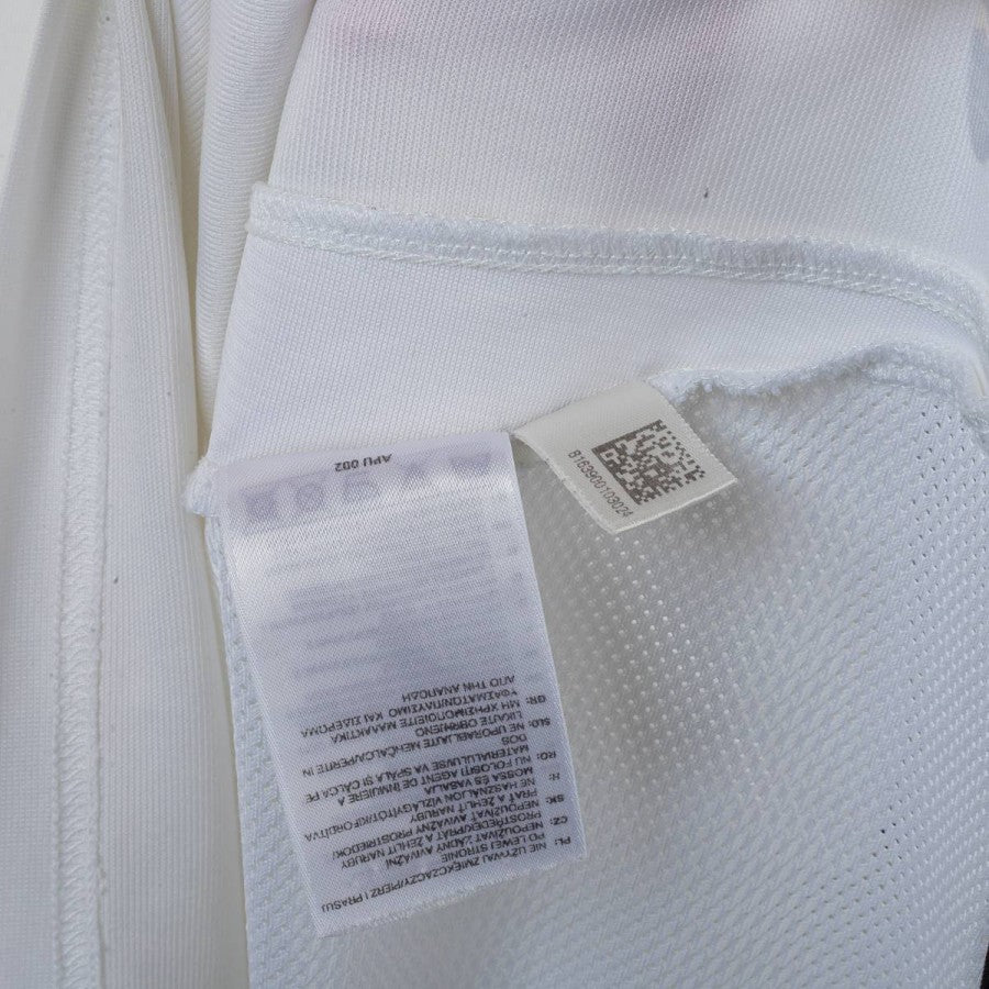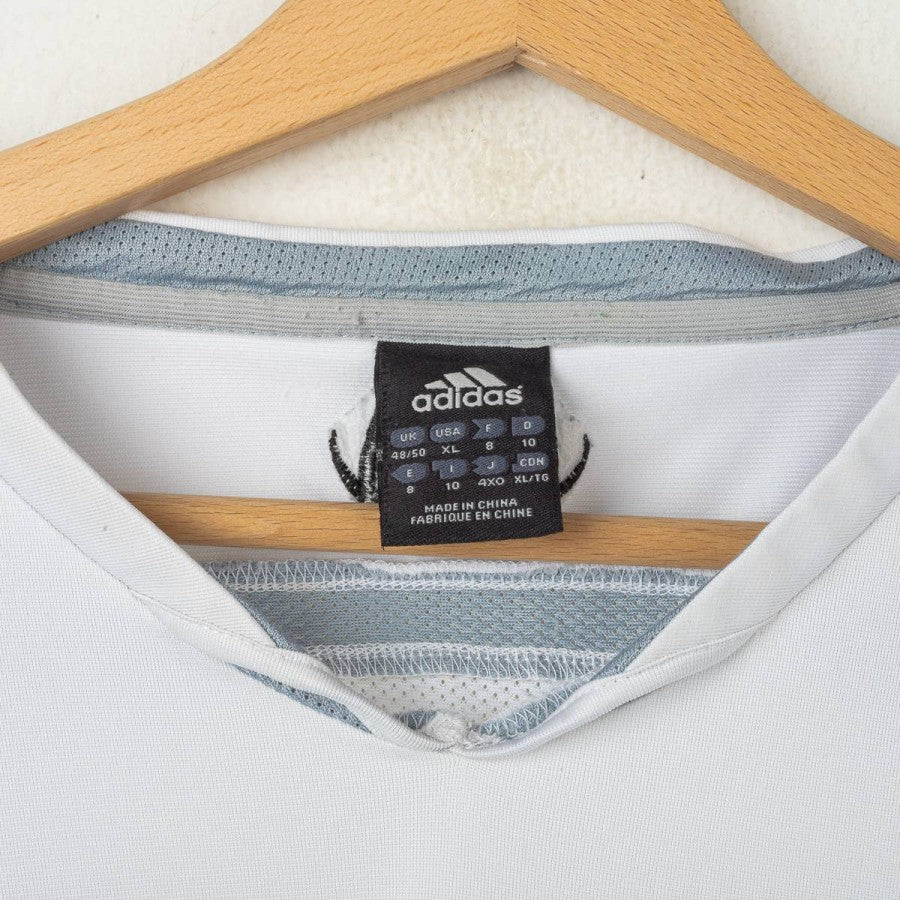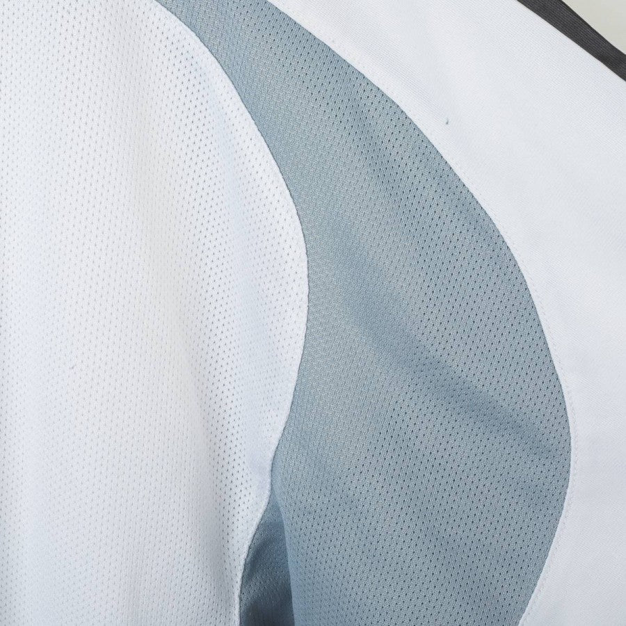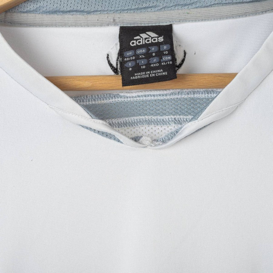 T-shirt da allenamento del Real Madrid utilizzata nella stagione 2004/2005, realizzata da Adidas. Modello a maniche corte con vestibilità comoda, colore bianco con inserti grigio chiaro e dettagli neri. Logo Adidas ricamato sul petto, stemma del club cucito lato cuore. Tecnologia ClimaCool per una maggiore traspirabilità. Collo a V rifinito in tessuto elasticizzato. Taglia XL.