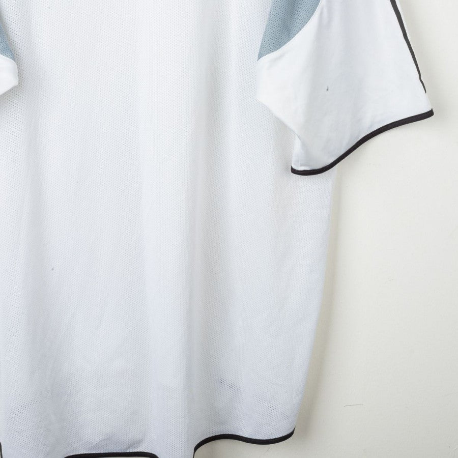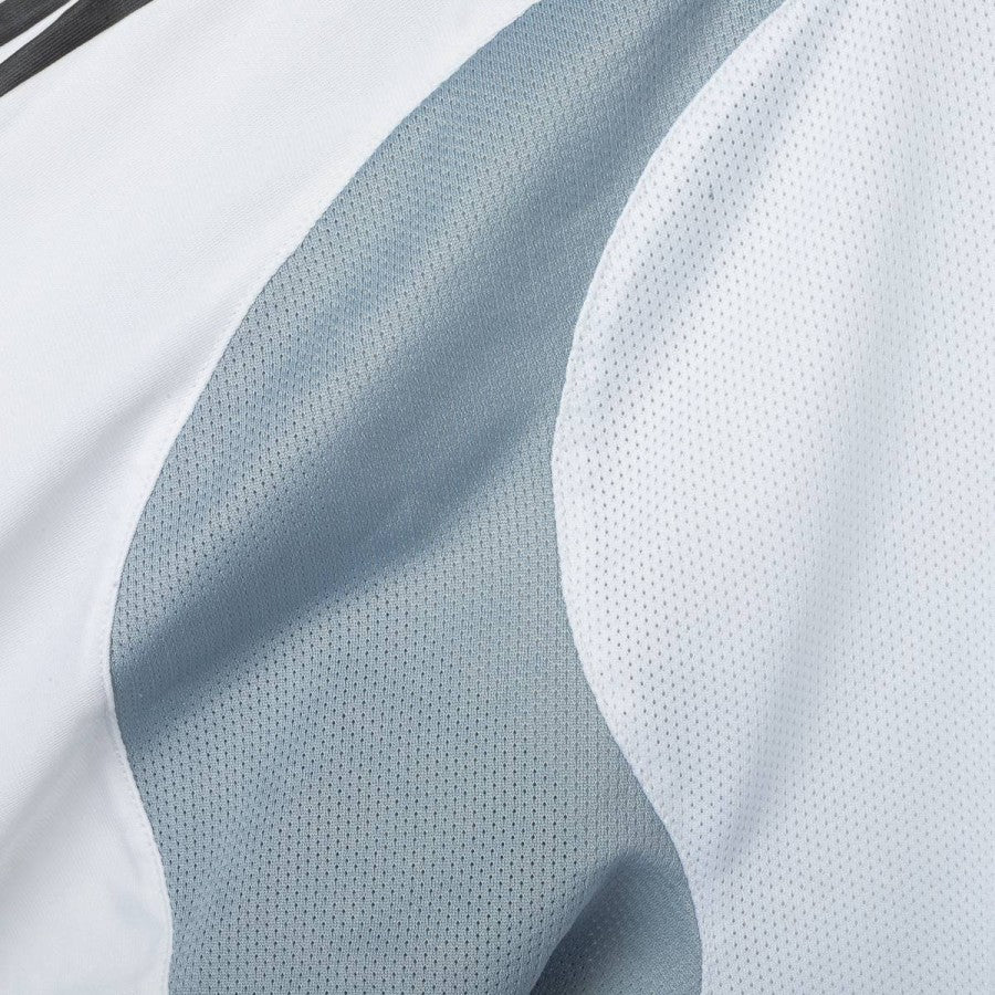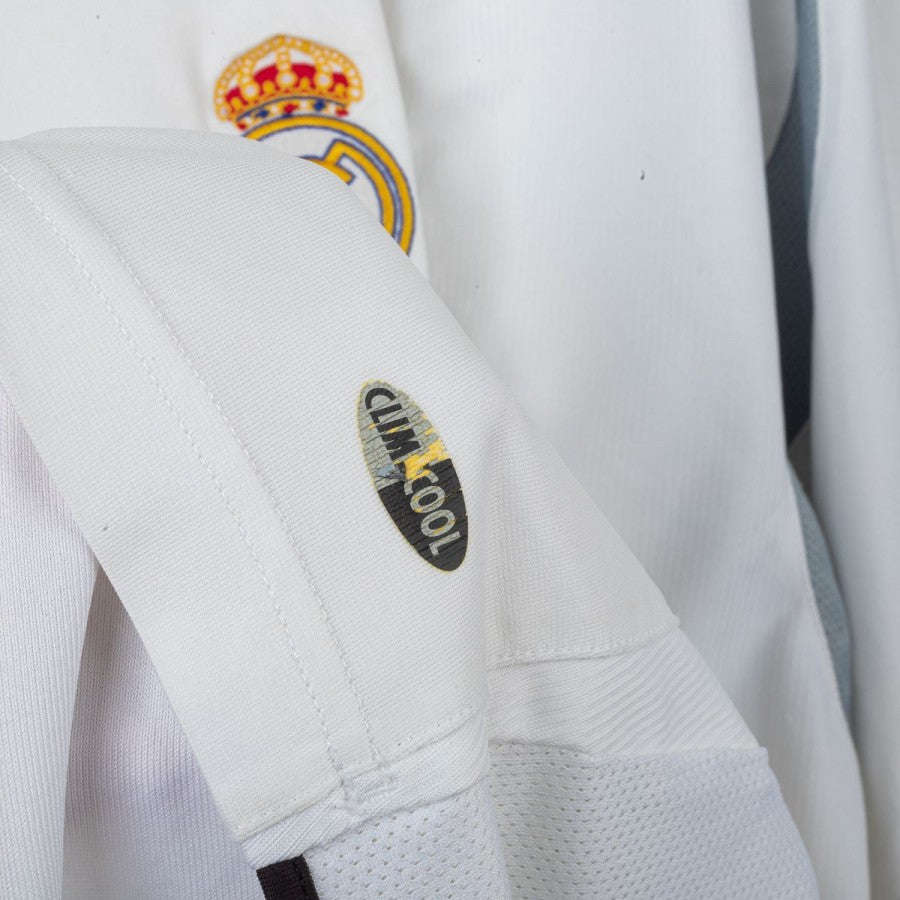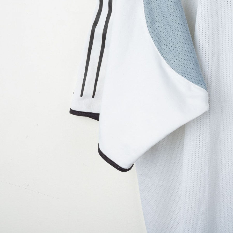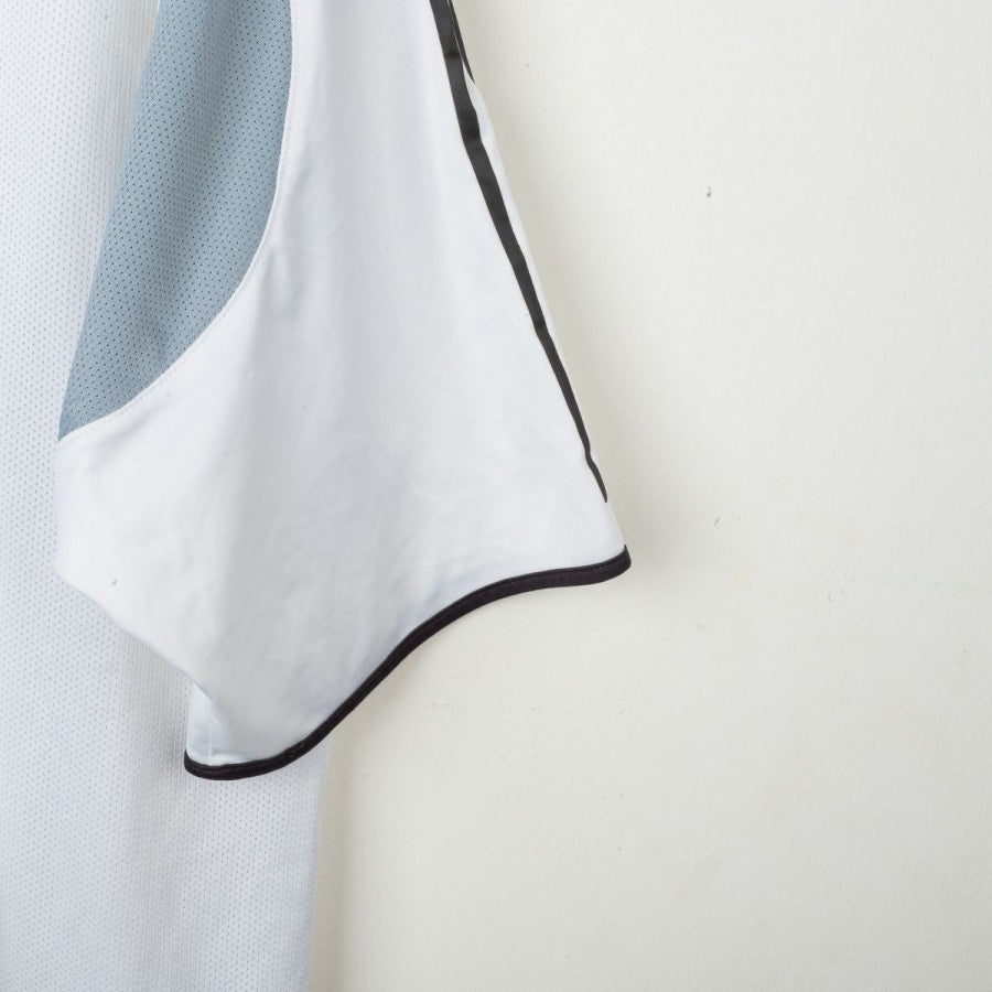 T-shirt da allenamento del Real Madrid utilizzata nella stagione 2004/2005, realizzata da Adidas. Modello a maniche corte con vestibilità comoda, colore bianco con inserti grigio chiaro e dettagli neri. Logo Adidas ricamato sul petto, stemma del club cucito lato cuore. Tecnologia ClimaCool per una maggiore traspirabilità. Collo a V rifinito in tessuto elasticizzato. Taglia XL.