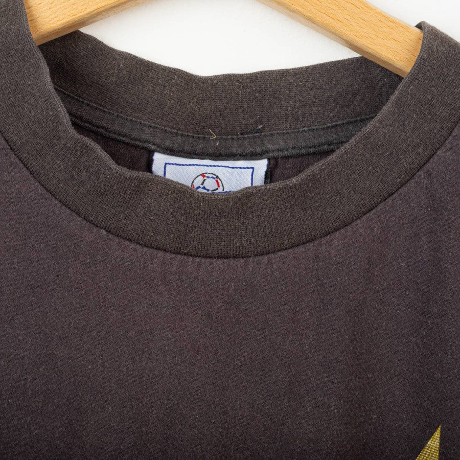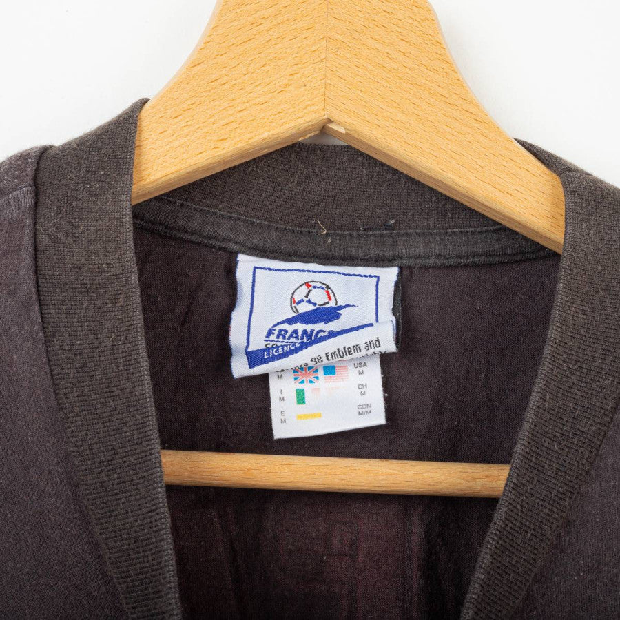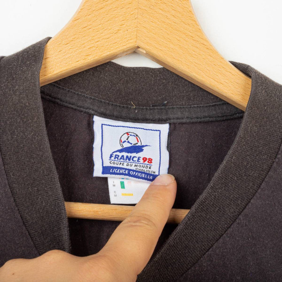 T-shirt ufficiale Adidas dedicata ad Alessandro Del Piero, realizzata in occasione dei Mondiali di Francia 1998. Design nero con grande stampa frontale raffigurante Del Piero in maglia azzurra e il trofeo della Coppa del Mondo, accompagnato dal nome in verticale e stelle dorate. Sul retro nome “Del Piero” e numero 10 in stampa dorata con logo Adidas. Logo ufficiale “France 98 Coupe du Monde” sulla manica. Taglia M. Un capo iconico per i tifosi italiani e i collezionisti del calcio anni '90.
