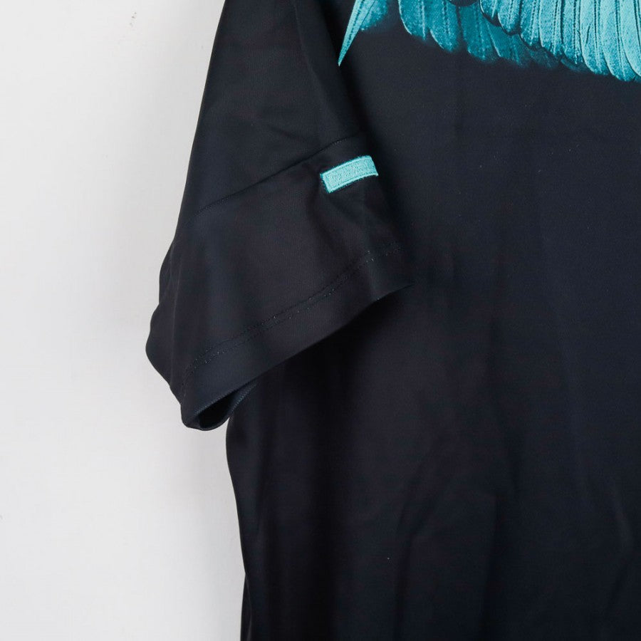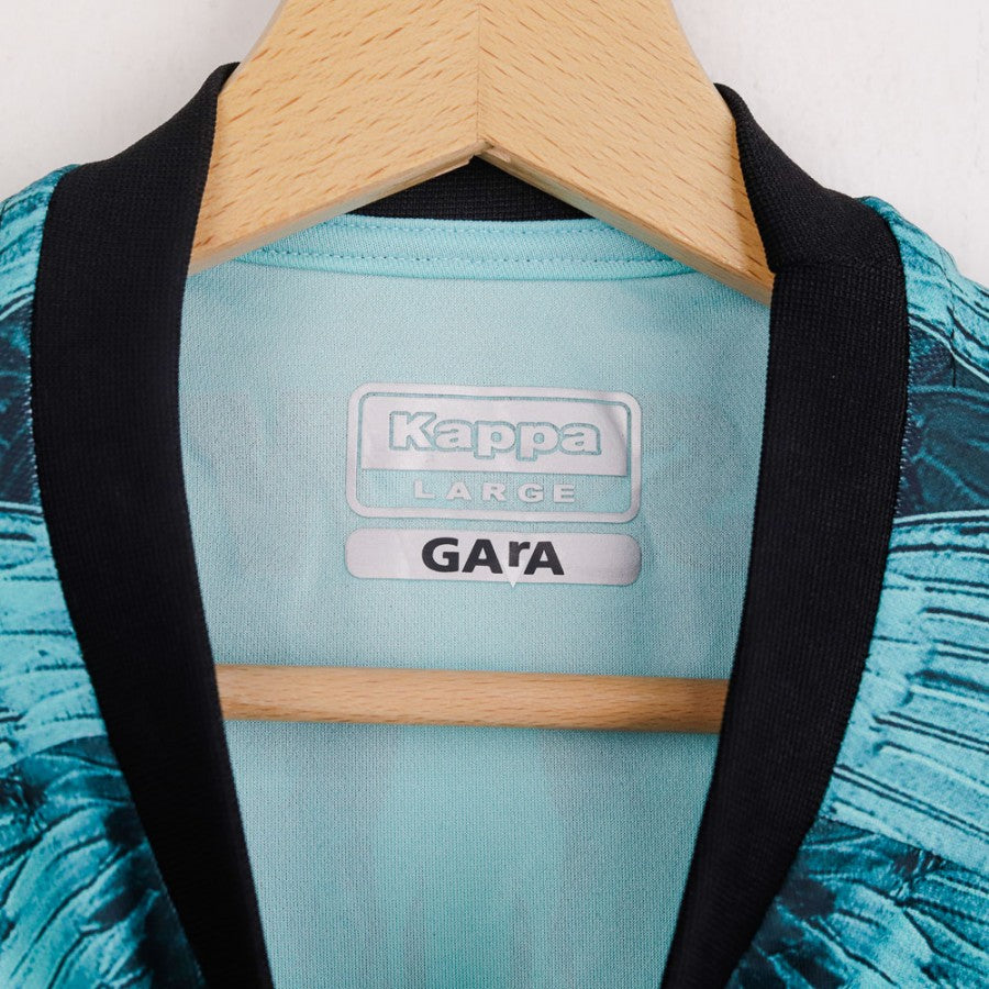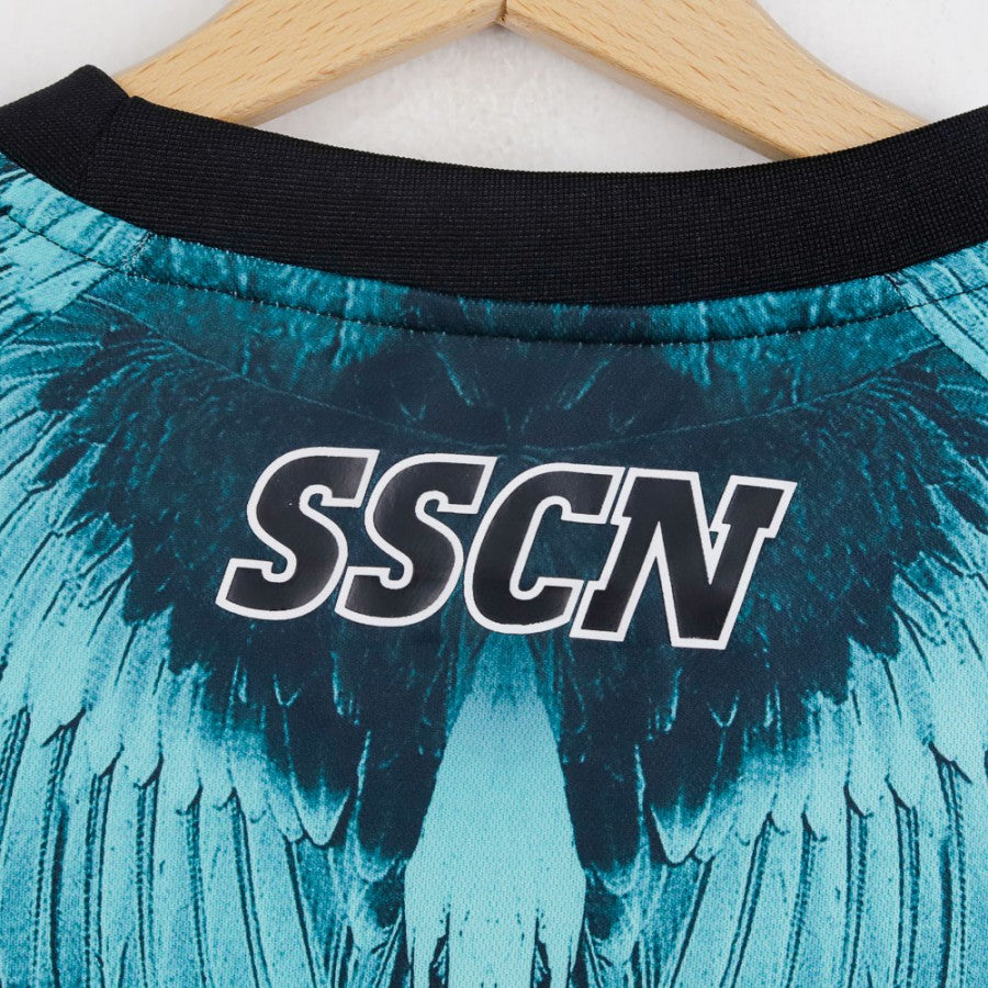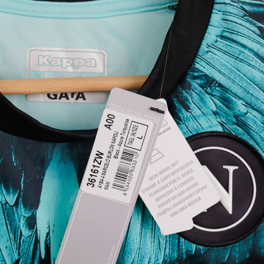 T-shirt speciale del Napoli per la stagione 2020/2021, prodotta da Kappa in collaborazione con Marcelo Burlon. Questo modello unico presenta un design innovativo con una grafica di ali stilizzate sulla parte superiore della maglia in tonalità turchese, su base nera. Sul petto sono presenti il logo Kappa e lo stemma SSC Napoli in versione monocromatica. Sulla parte posteriore è riportata la sigla "SSCN", che richiama l'identità del club. La maglia è realizzata in tessuto tecnico "GARA", caratteristico delle versioni da campo. Taglia L.