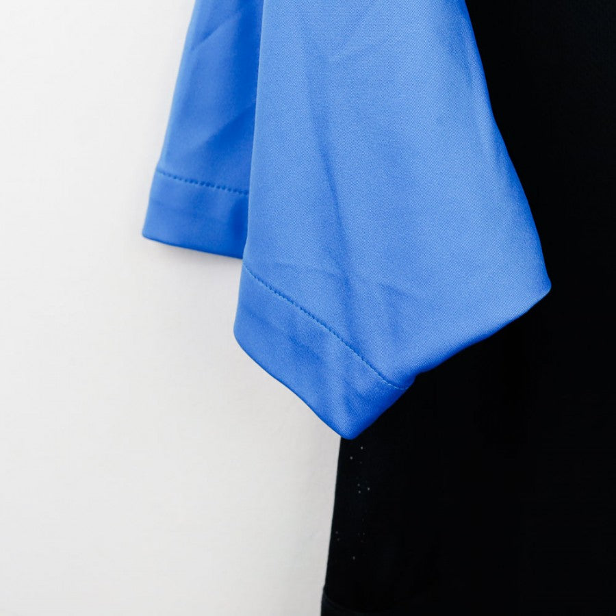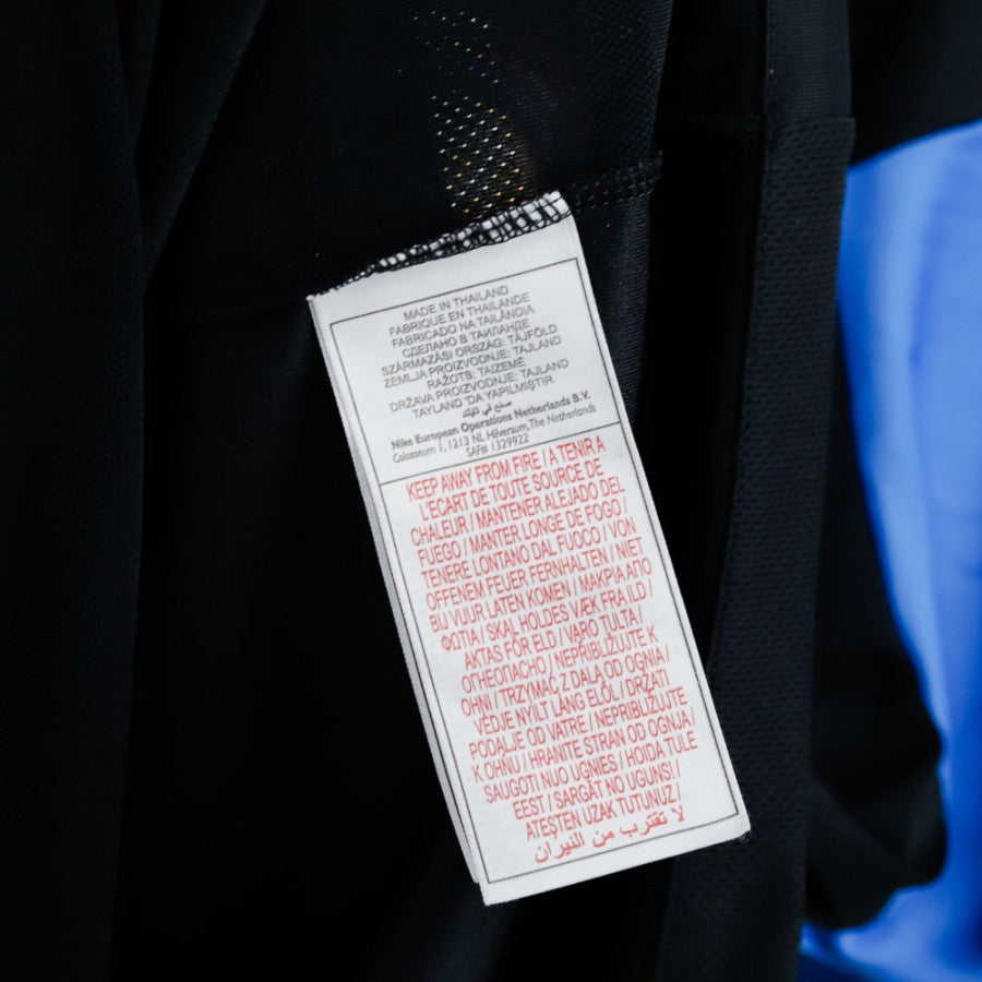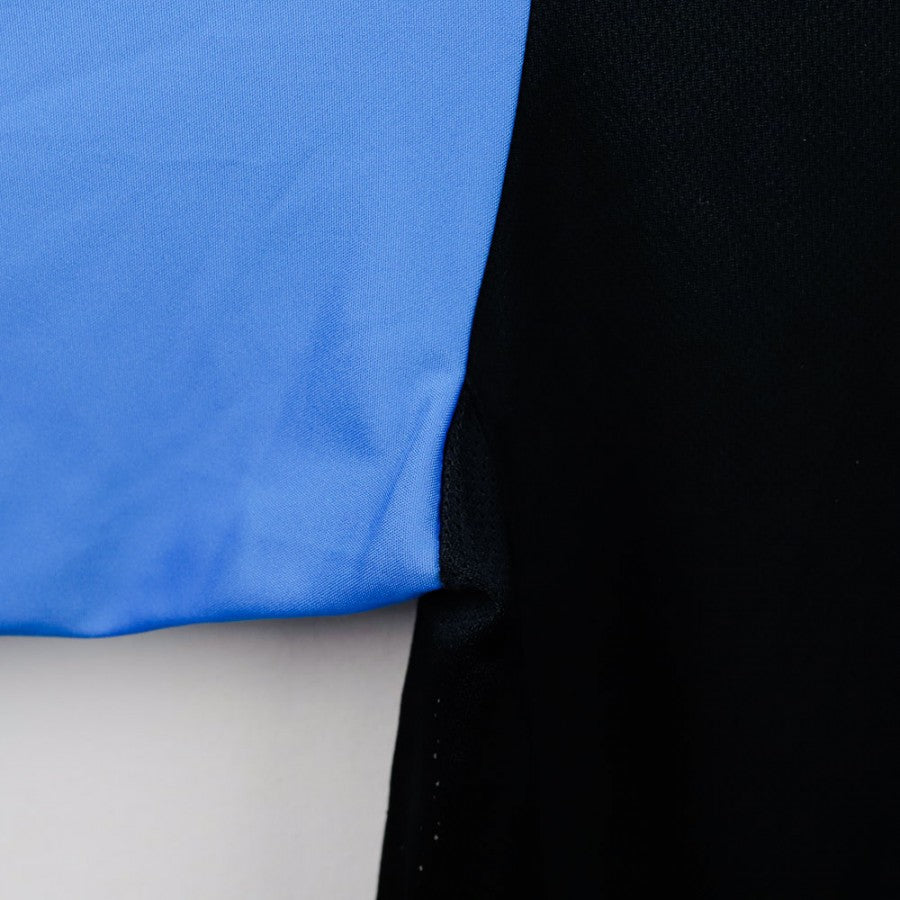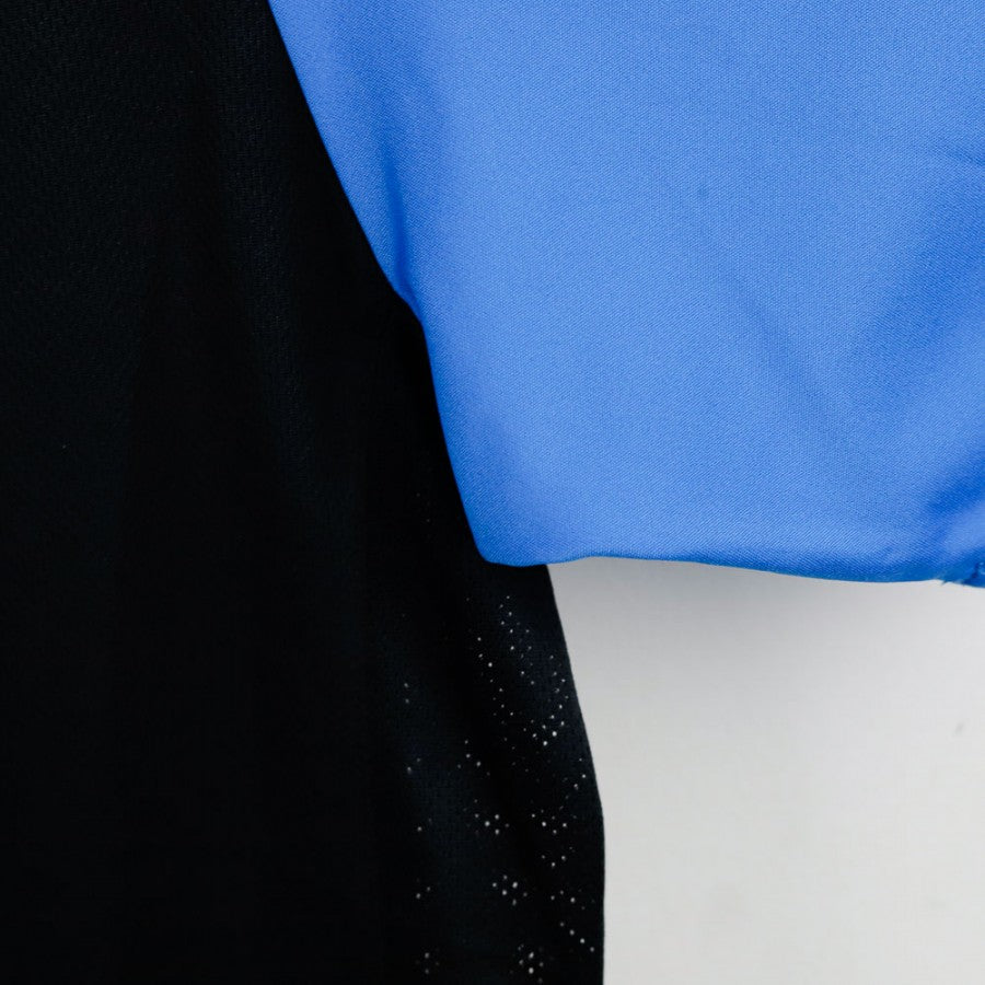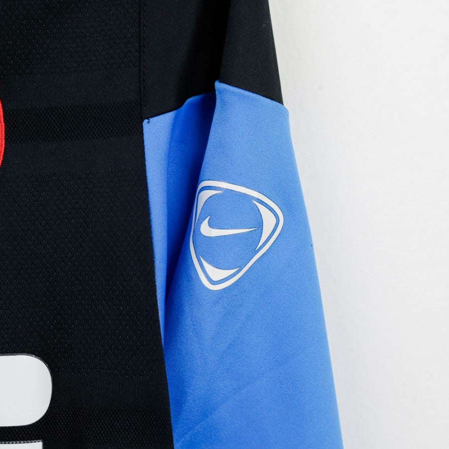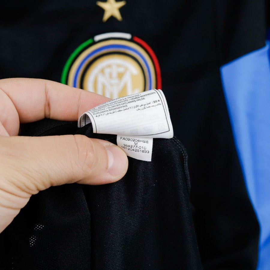 T-shirt Training Inter Nike Triplete 2009/2010 in taglia M, realizzata da Nike in occasione della storica stagione del triplete. Il design è caratterizzato da un corpo nero con maniche celesti e il logo Pirelli come sponsor commerciale, oltre al logo Nike come sponsor tecnico. Presente anche lo stemma dell'Inter con la stella celebrativa.