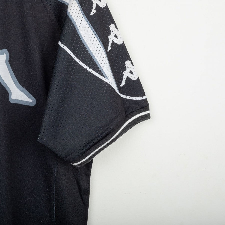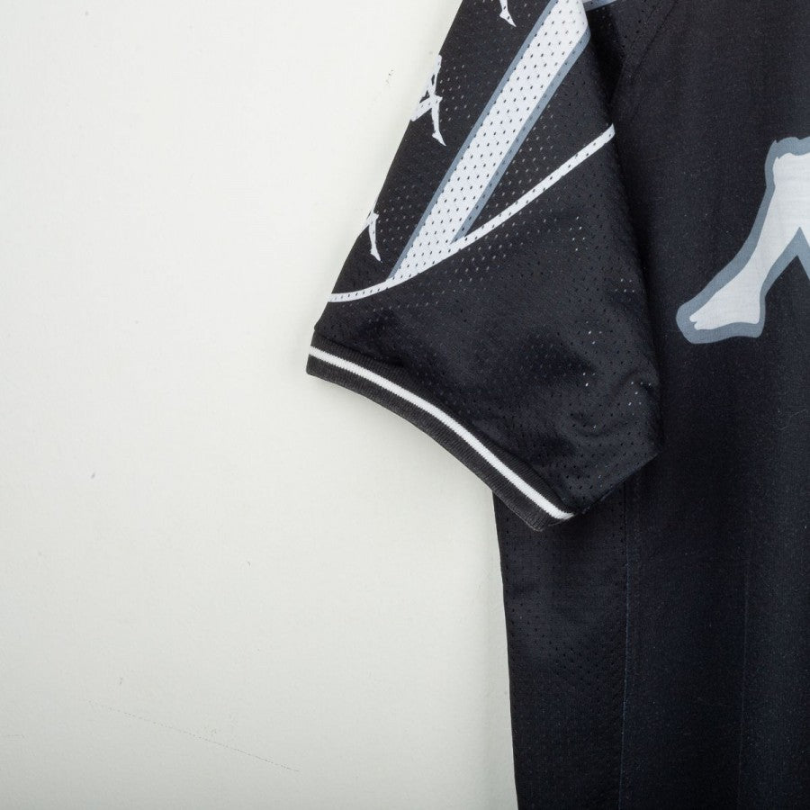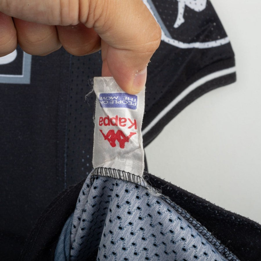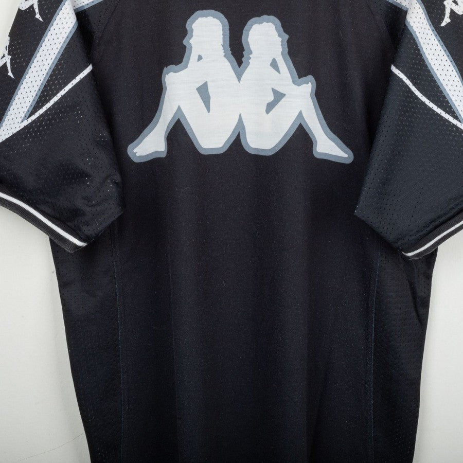 T-shirt da allenamento della Juventus stagione 1999/2000, prodotta da Kappa. Colore nero con dettagli grigi e bianchi. Logo Kappa ricamato sul petto, grande scritta “JUVENTUS” stampata sul fronte. Maniche con inserti in mesh traspirante e banda Kappa laterale. Sul retro maxi logo Kappa stampato e scritta Juventus in bianco. Colletto a V con bordini bianchi. Vestibilità regolare. Taglia M.