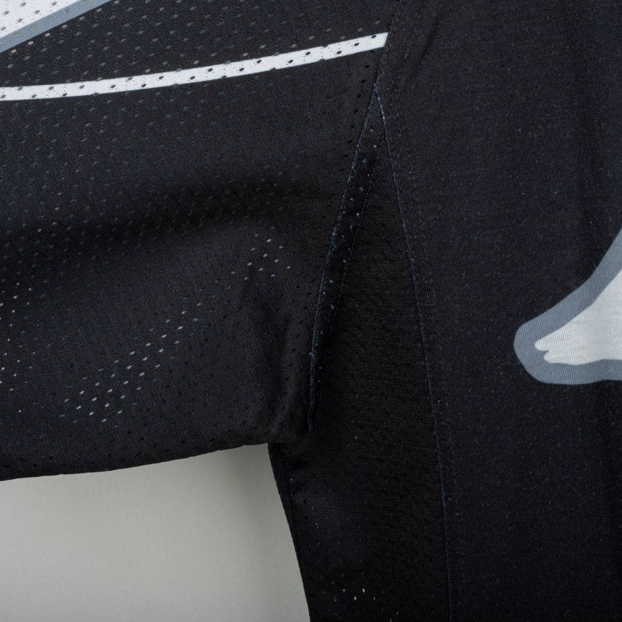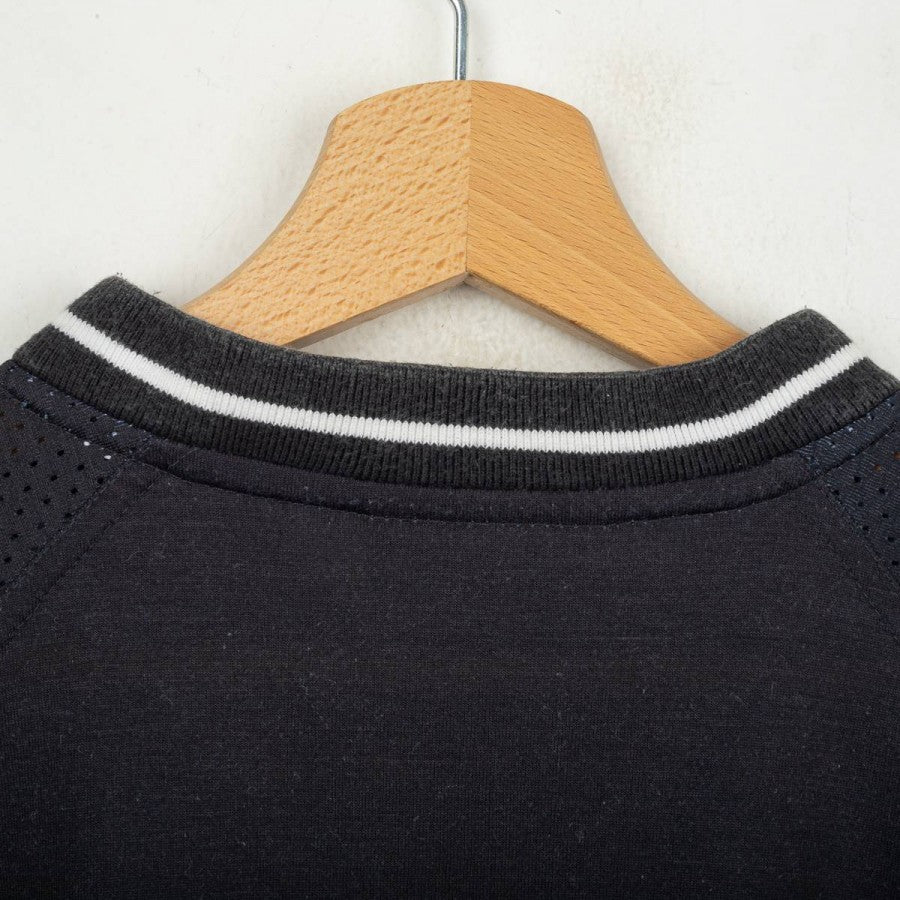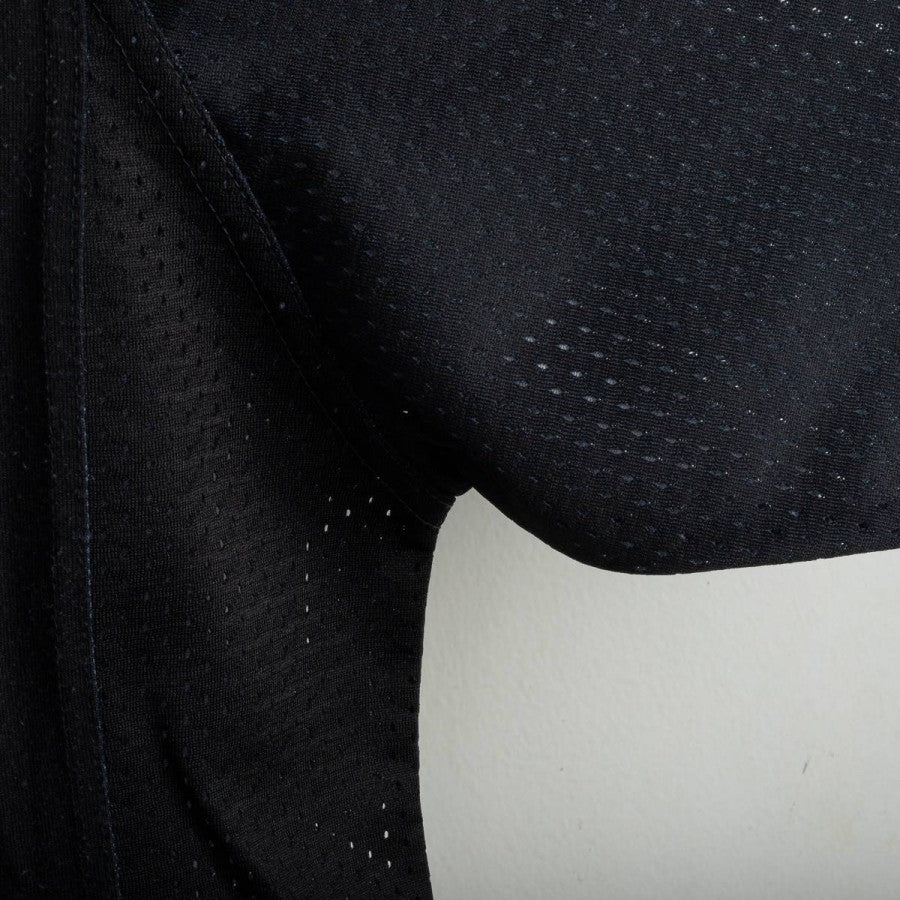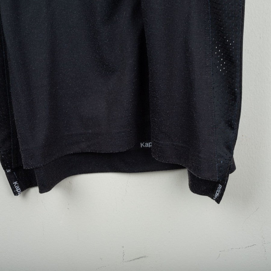 T-shirt da allenamento della Juventus stagione 1999/2000, prodotta da Kappa. Colore nero con dettagli grigi e bianchi. Logo Kappa ricamato sul petto, grande scritta “JUVENTUS” stampata sul fronte. Maniche con inserti in mesh traspirante e banda Kappa laterale. Sul retro maxi logo Kappa stampato e scritta Juventus in bianco. Colletto a V con bordini bianchi. Vestibilità regolare. Taglia M.