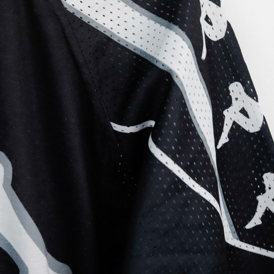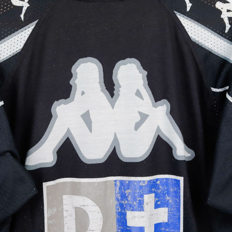 T-shirt da allenamento ufficiale della Juventus per la stagione 1999/2000, realizzata dallo sponsor tecnico Kappa. Il capo è di colore nero con dettagli grigi a contrasto, e presenta un design tecnico con tessuto traforato su spalle e fianchi. Sul petto troviamo il logo Kappa, lo sponsor commerciale D+ (Libertà Digitale) e la scritta Juventus in bianco. Sul retro spiccano il maxi logo Kappa, il grande sponsor D+ e la scritta Juventus. La taglia è indicata come M, visibile sull'etichetta “Kappa Gara – Official Pro Equipment”.