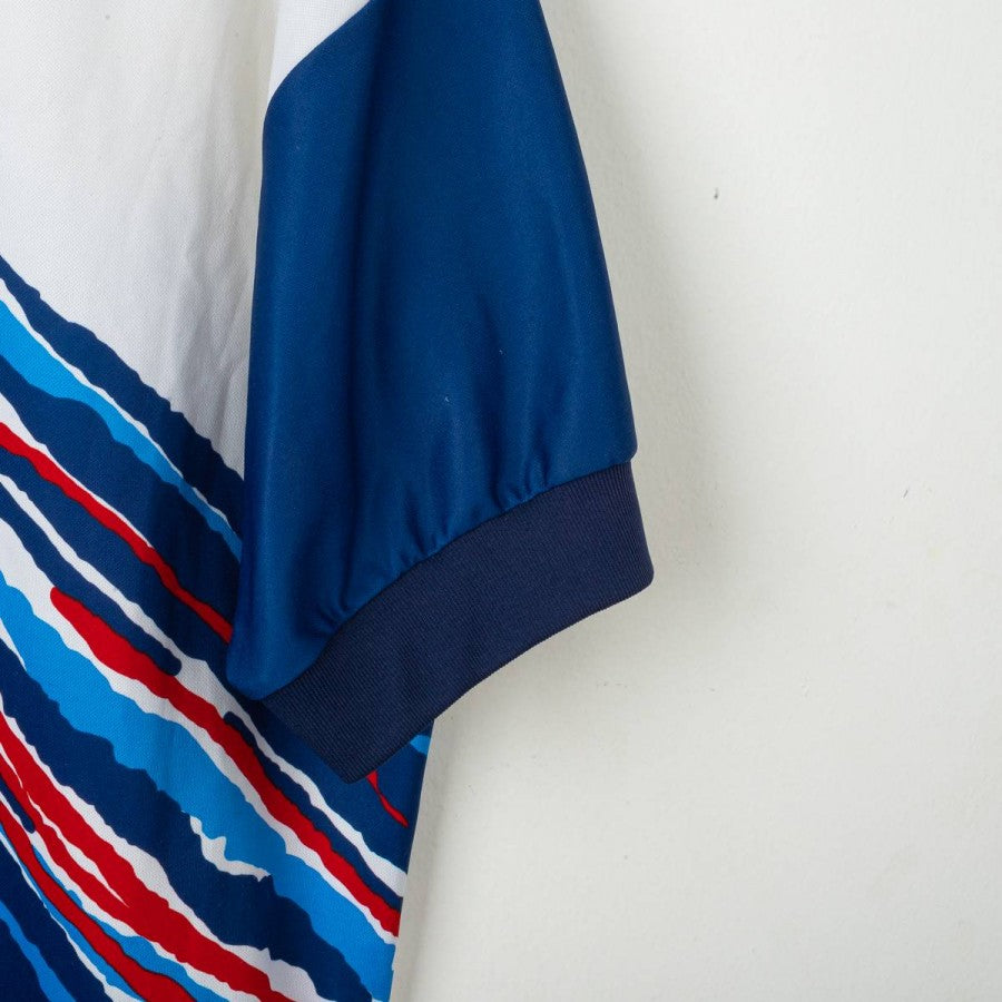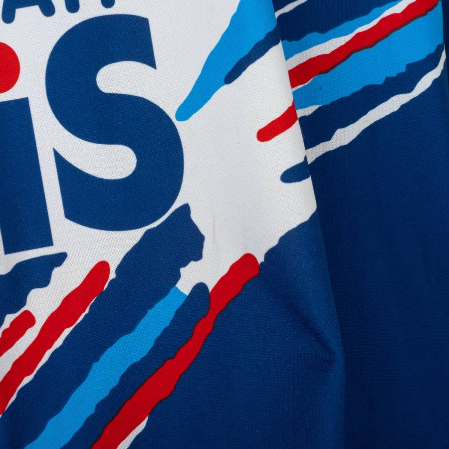T-shirt da allenamento del Pescara, stagione 1998/1999, prodotta da Puma. Design grafico iconico con fascia diagonale multicolore e sponsor Gelati GIS applicato fronte e retro. Colore dominante blu con spalle bianche e collo rosso a costine. Logo Puma e stemma Pescara Calcio applicati sul petto. Modello a maniche corte, taglia XL.