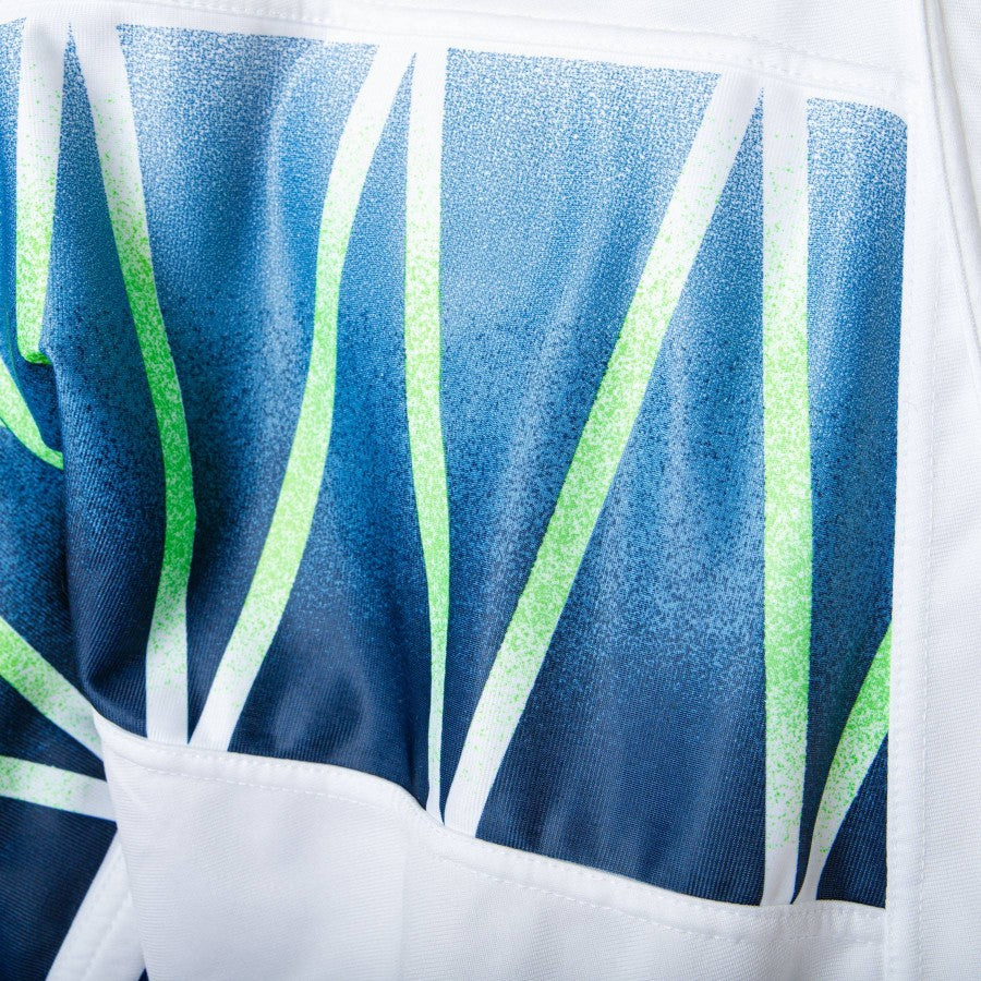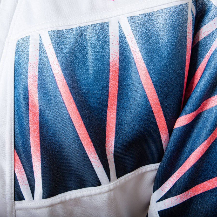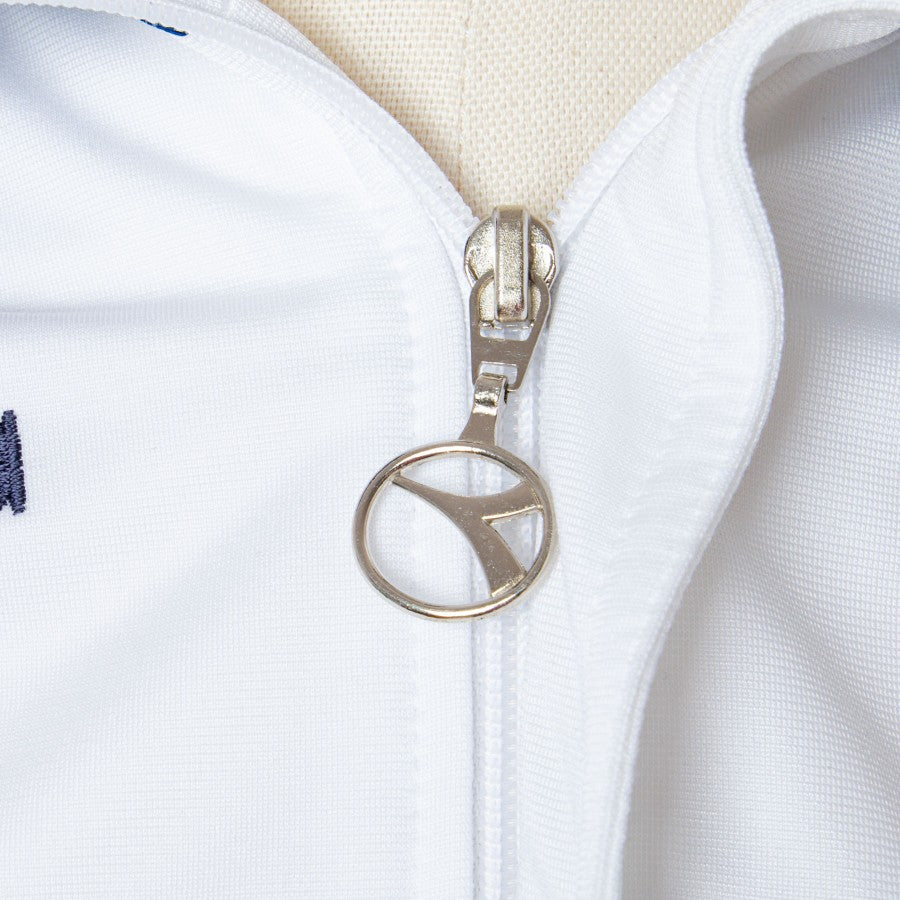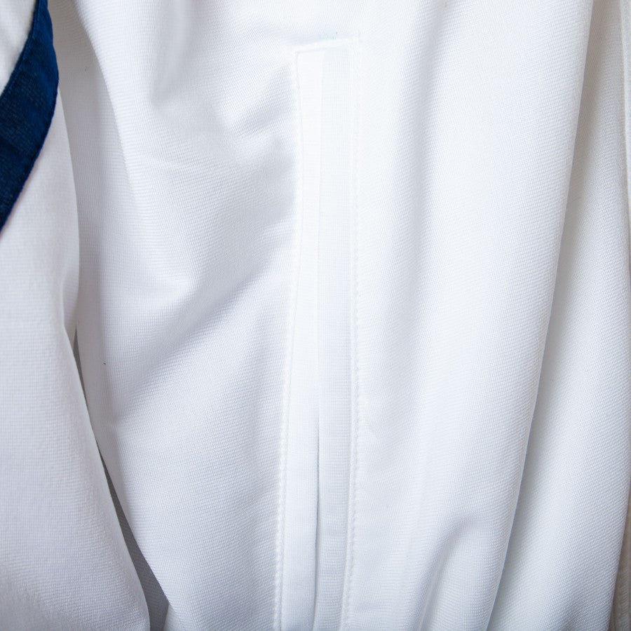 Modello di colore bianco e blu e con fantasia di colori verde e rosso. La felpa full zip è munita di tasche laterali e porta la bandiera italiana e lo sponsor tecnico Diadora in ricamo.