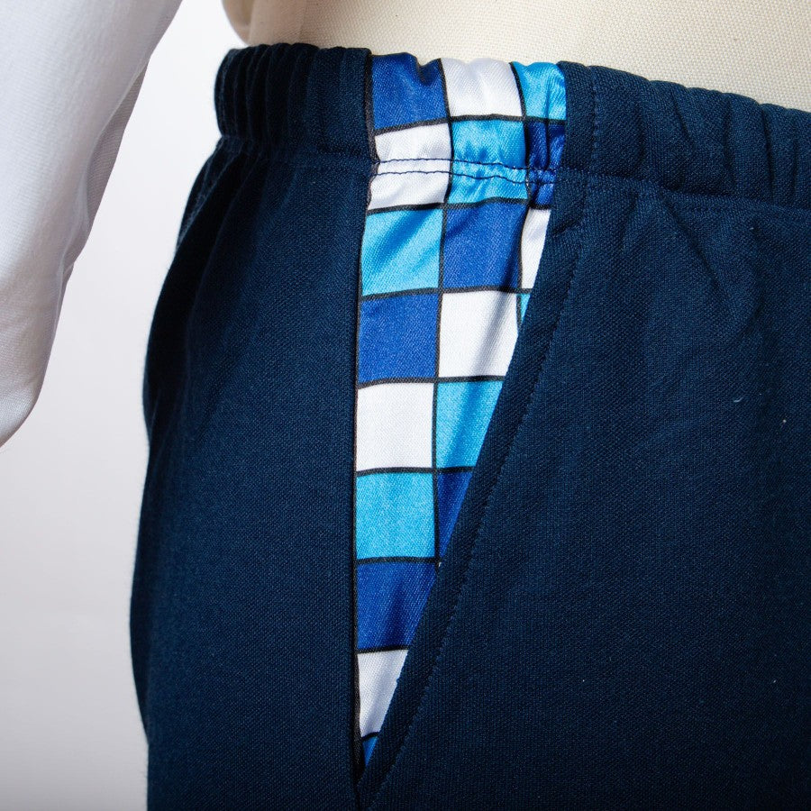 Anche i pantaloni, completamente blu, sono muniti di comode tasche laterali, dove sono inserite le uniche note di colore. Laccetto regolabile in vita.