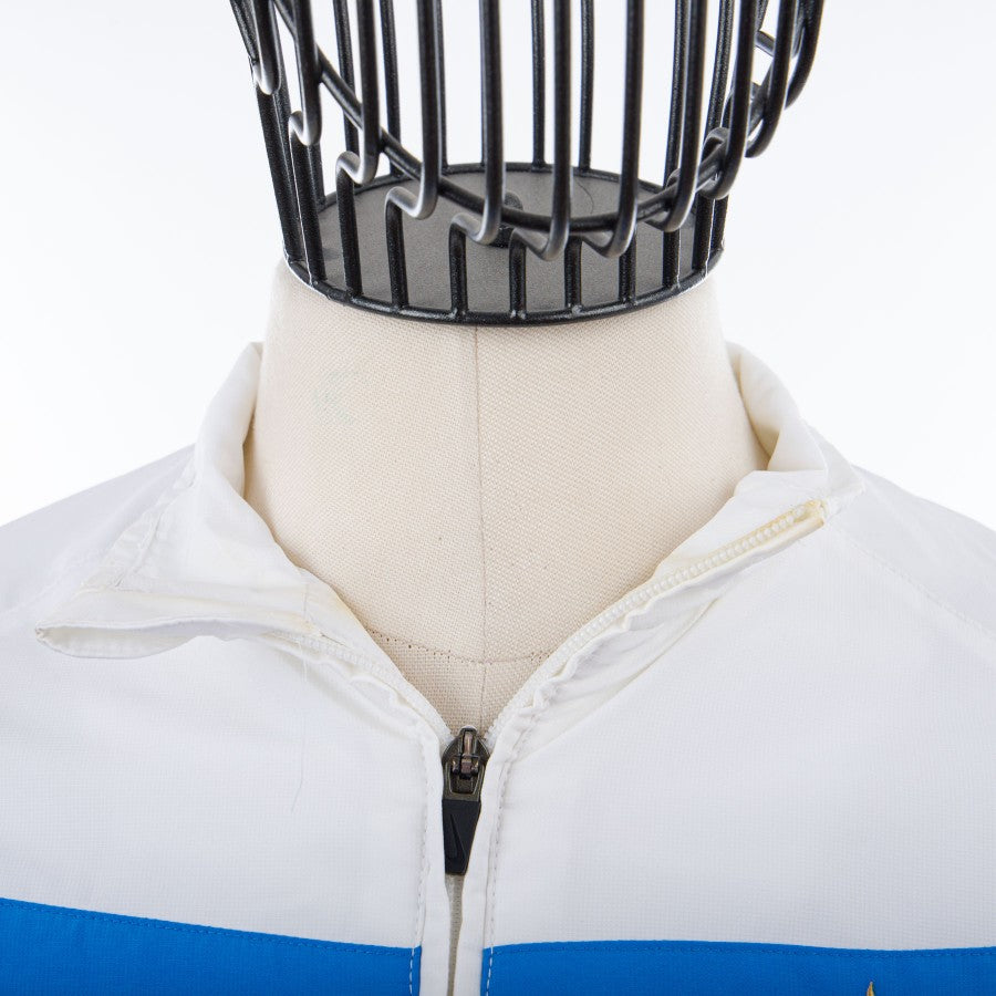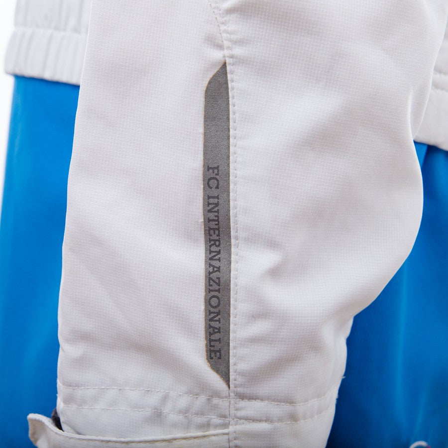 La tuta in tessuto acetato della squadra milanese è composta da pantaloni azzurri e giacca bianca con chiusura in full zip ed inserti in azzurro sul petto e sulle maniche.