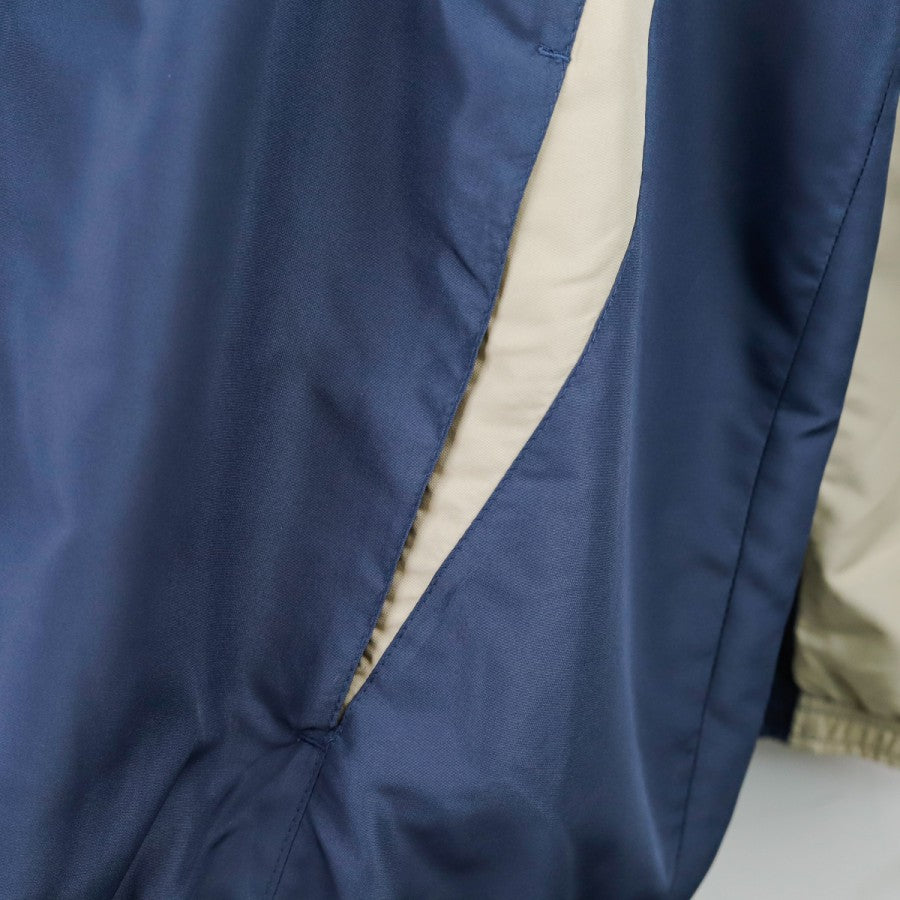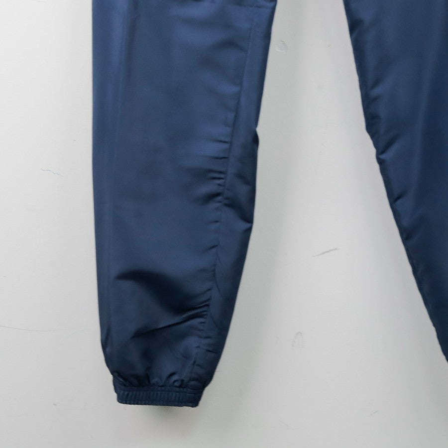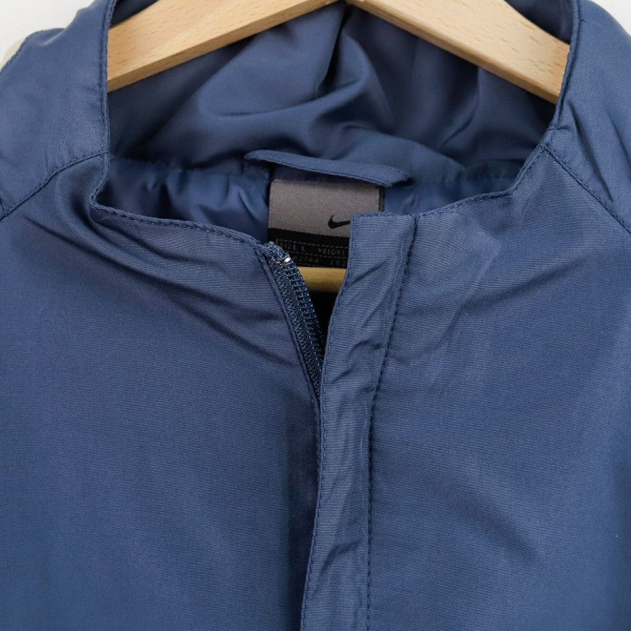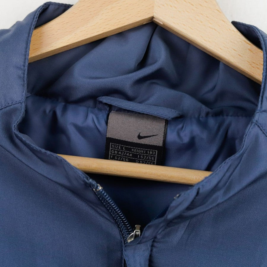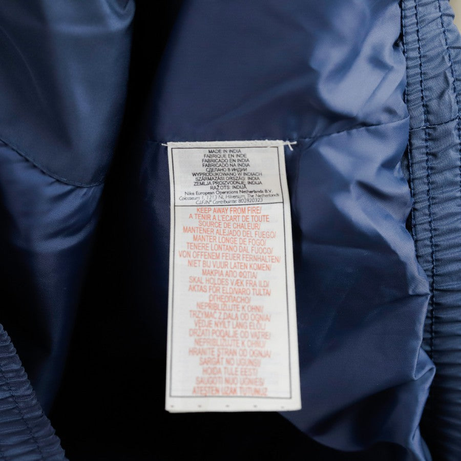 Tuta Inter Nike Pirelli 2002/2003 composta da giacca e pantaloni in tessuto tecnico blu con inserti panna. La giacca presenta lo stemma dell'Inter e lo sponsor commerciale Pirelli sul petto, mentre il logo tecnico Nike è visibile su entrambi i lati. Il pantalone riprende lo stesso tono blu della giacca con swoosh Nike sul fianco.