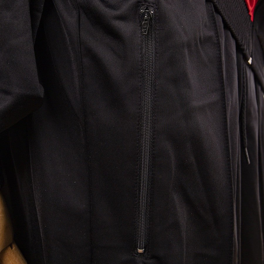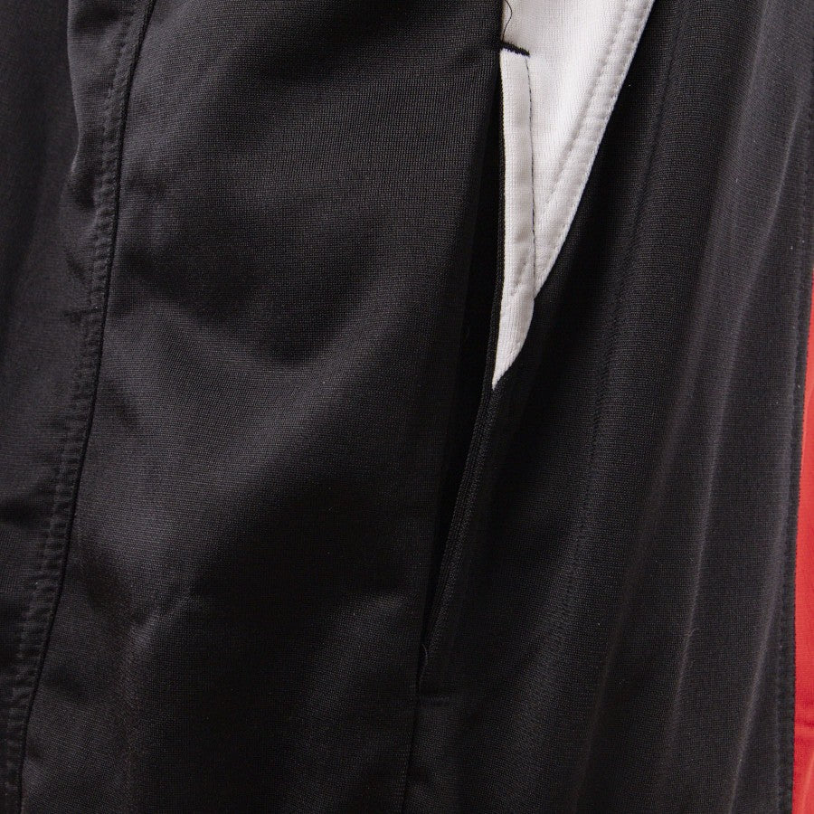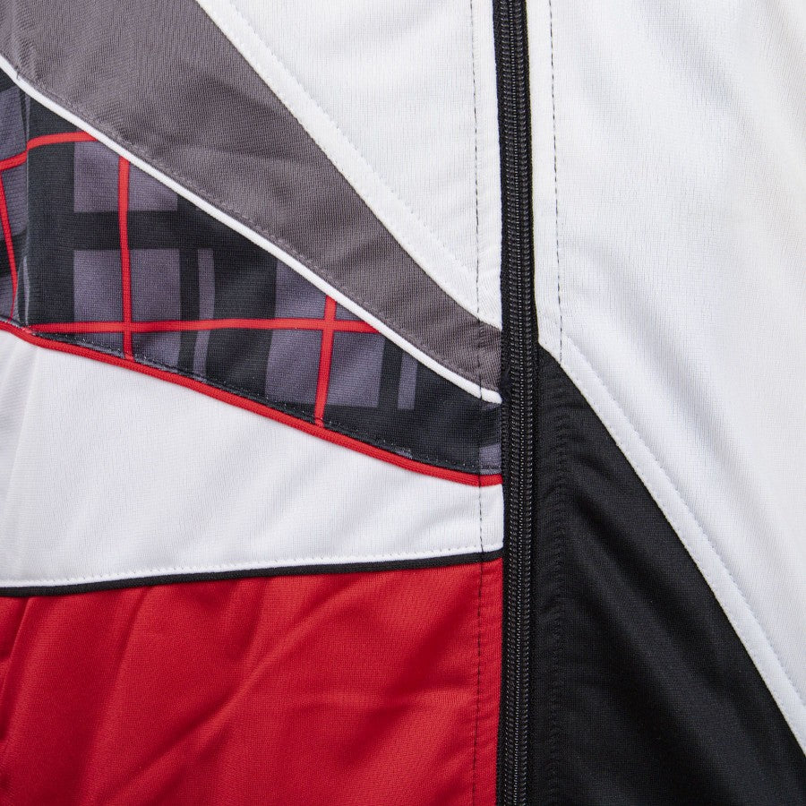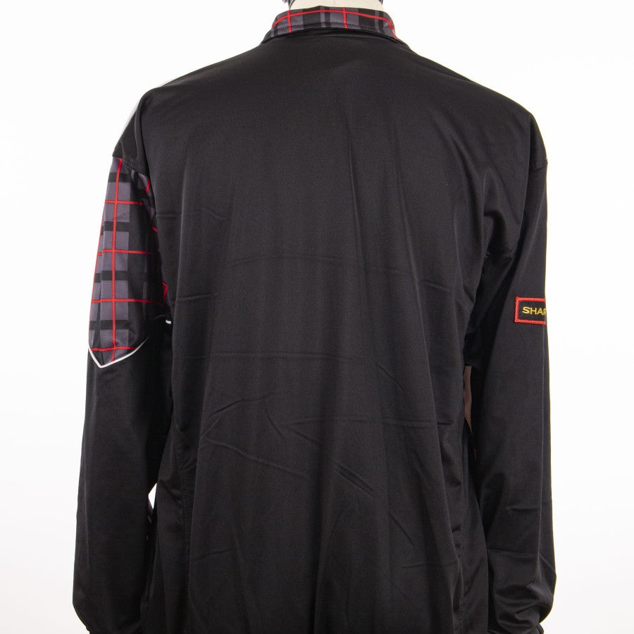 Modello tuta walk out, si presenta con una fantasia singolare, dal colore prevalentemente bianco, nero, rosso. La tua presenta la cerniera integrale frontale, le maniche sono nere, mentre l'interno del colletto è in fantasia reticolata, presente sia sulla spalla destra che nel costato sinitro. presenti tasche laterali capienti con chiusura a zip. Sulla parte frontale superiore, prevalentemente bianca, è ricamato il logo dello sponsor tecnico umbro e lo stemma societario del Manchester United. Il pantaloni sono interamente neri con in ricamo il logo Umbro sulla coscia destra.
