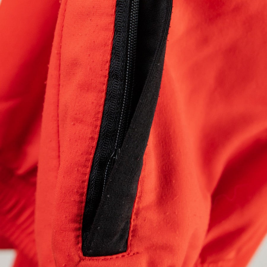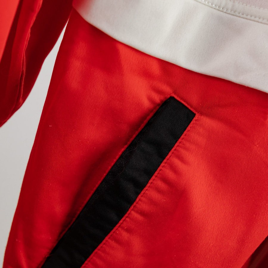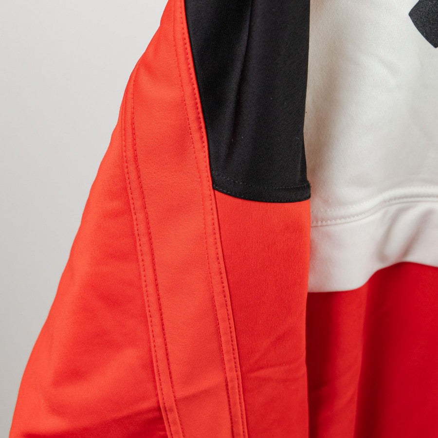 Modello a maniche lunghe di colore rossonero con inserti bianchi. Full zip con tasche laterali. Lato cuore stemma squadra Milan e sponsor commerciale Opel. Sul retro lo sponsor commerciale Opel e sponsor tecnico Lotto in formato grande.