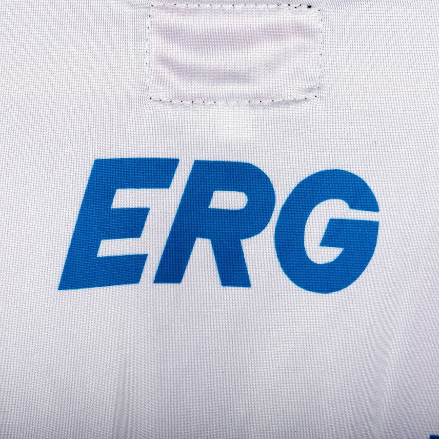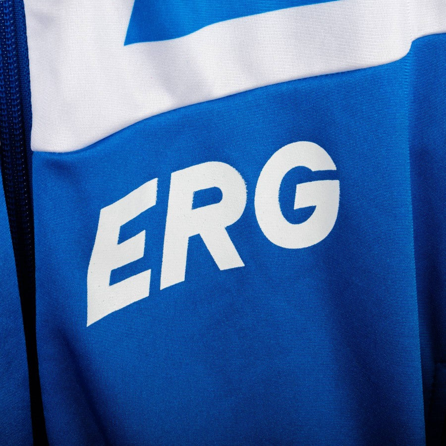 Modello full zip di colore blu, bianco e rosso con bande laterali. Lato destro troviamo lo stemma della squadra, sulla sinistra logo Asics in un rettangolo nero. Tasche laterali presenti sul fronte. Sponsor commerciale ERG presente sia sul fronte che sul retro.