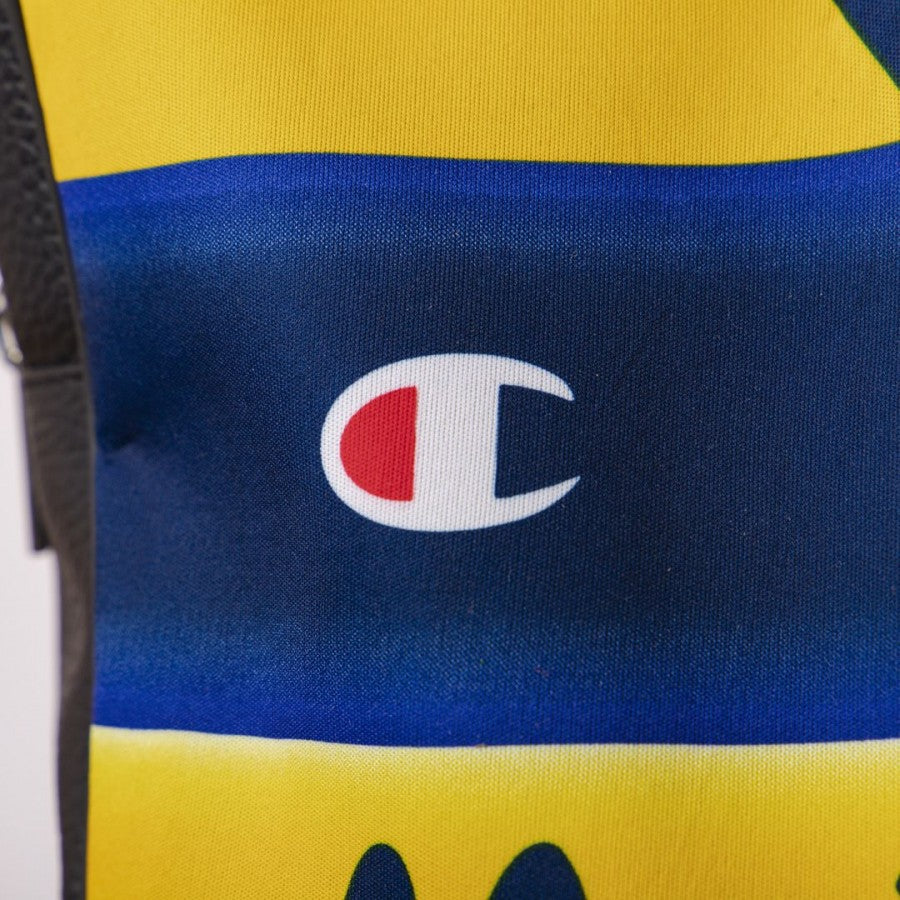 Maglia di colore giallo e blu prodotta dalla Champion con Sponsor MR. DAY.